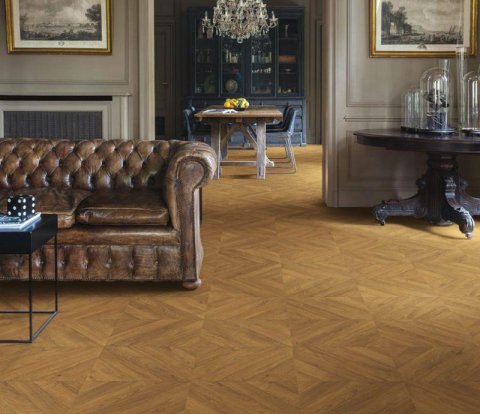 Интернет-магазин напольных покрытий МОС-ПАРКЕТ представляет вашему вниманию водостойкий ламинат 33 класса от компании Quick-Step из коллекции Castle толщиной 12 мм. Дизайн выполнен под французская елочку, декор Дуб горчичный. Водостойкая технология Hydroseal защищает ламинат от проникновения влаги и совместим с системами тёплых полов. Планки, размером 1200×396 мм, на замковой системе Uniclic имеют вдавленную U-образную фаску по двум сторонам.