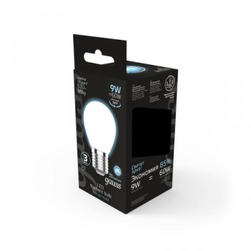 Светодиодная лампочка в форме шара с цоколем E27 и размерами 72 мм по высоте и диаметром в 45 мм обладает мощностью в 9 W, благодаря чему она может осветить 3 кв. м. Цветовая температура – 4100 К, т.е. белый свет, подходящий для рабочего настроя (не рекомендуется для детской комнаты). Изделие рассчитано на использование в сети с переменным напряжением в 220-240В.