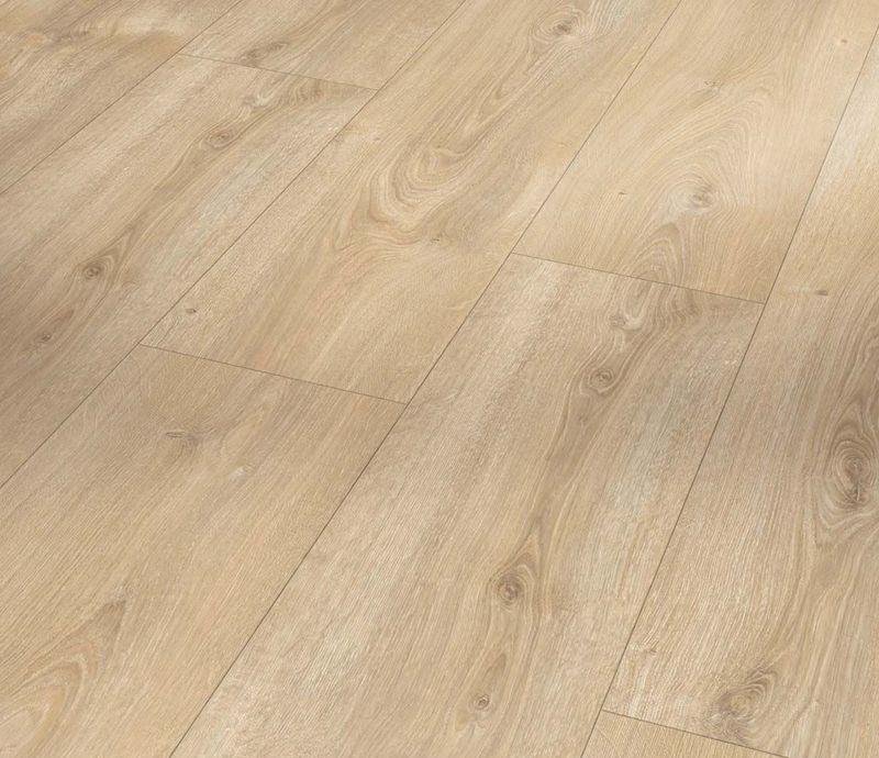 Однополосный ламинат 32 класса серии Basic в декоре Дуб Нова выбеленный светлый (Nova Light Limed Oak) бежевого цвета от производителя Parador толщиной 8 мм, на замковой системе Safe-Lock PRO с фаской по периметру. Полуматовая поверхность с текстурой дуба. Специальная основная плита Aqua-Proof позволяет использовать настил даже во влажных помещениях на систему теплых полов.
