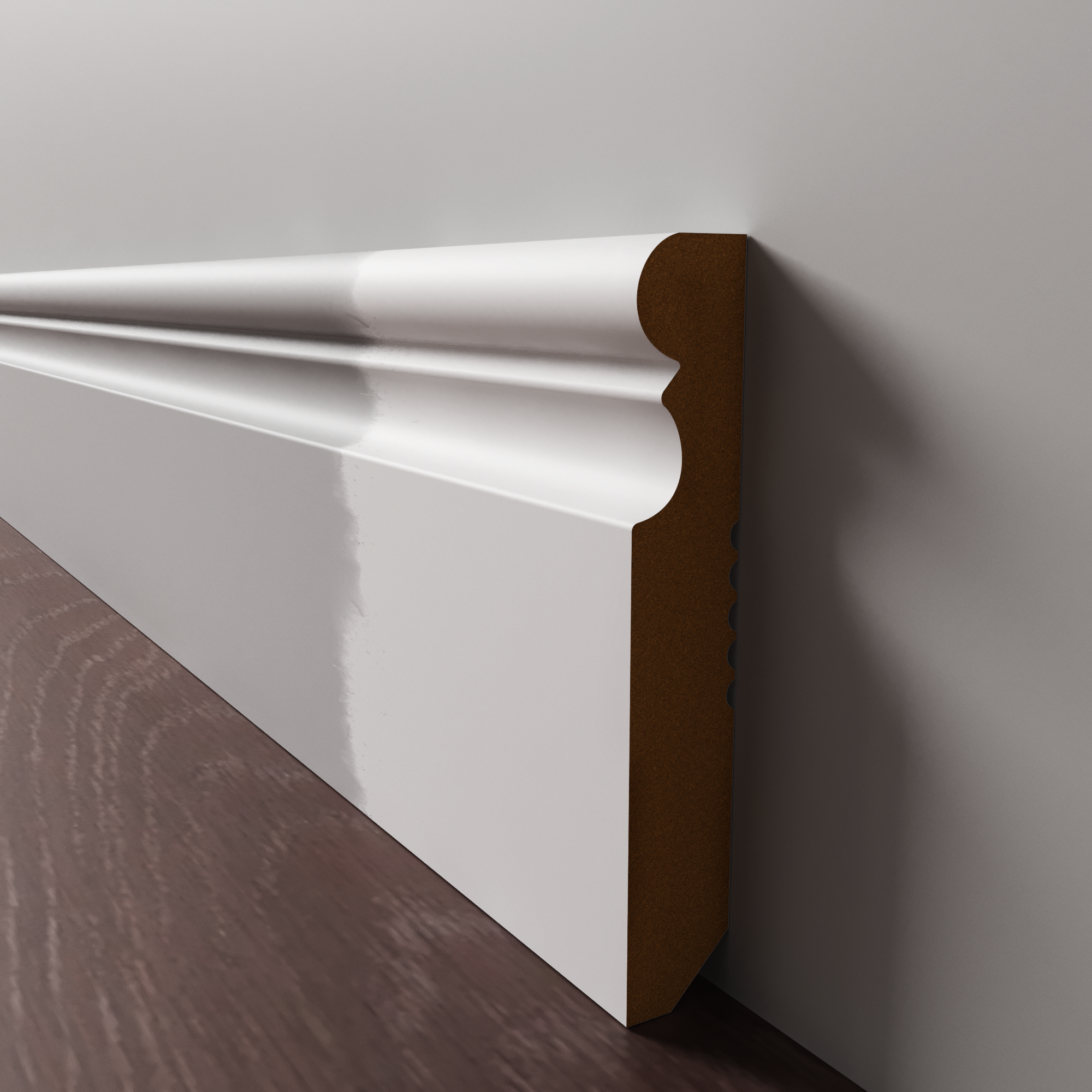 Напольный плинтус из МДФ обладает гладкой структурой, что делает его пригодным к окрашиванию в любой цвет на заказ по таблицам RAL и NCS. Срок покраски 3-5 дней.  Складская программа содержит грунтованные профили под покраску.