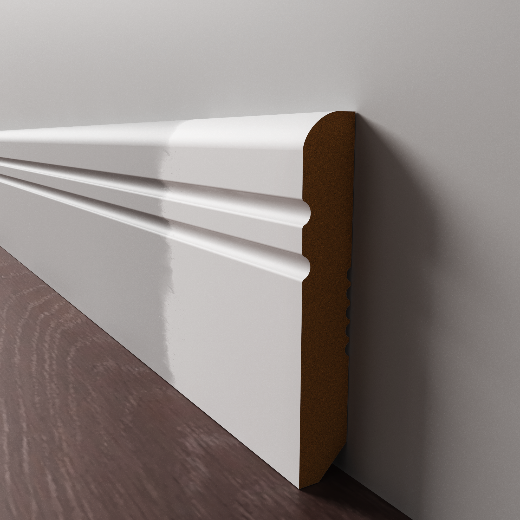 Напольный плинтус из МДФ обладает гладкой структурой, что делает его пригодным к окрашиванию в любой цвет на заказ по таблицам RAL и NCS. Срок покраски 3-5 дней.  Складская программа содержит грунтованные профили под покраску.