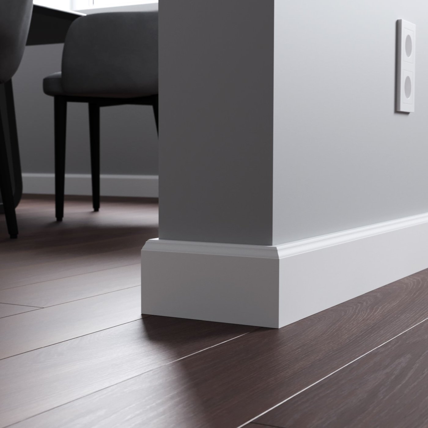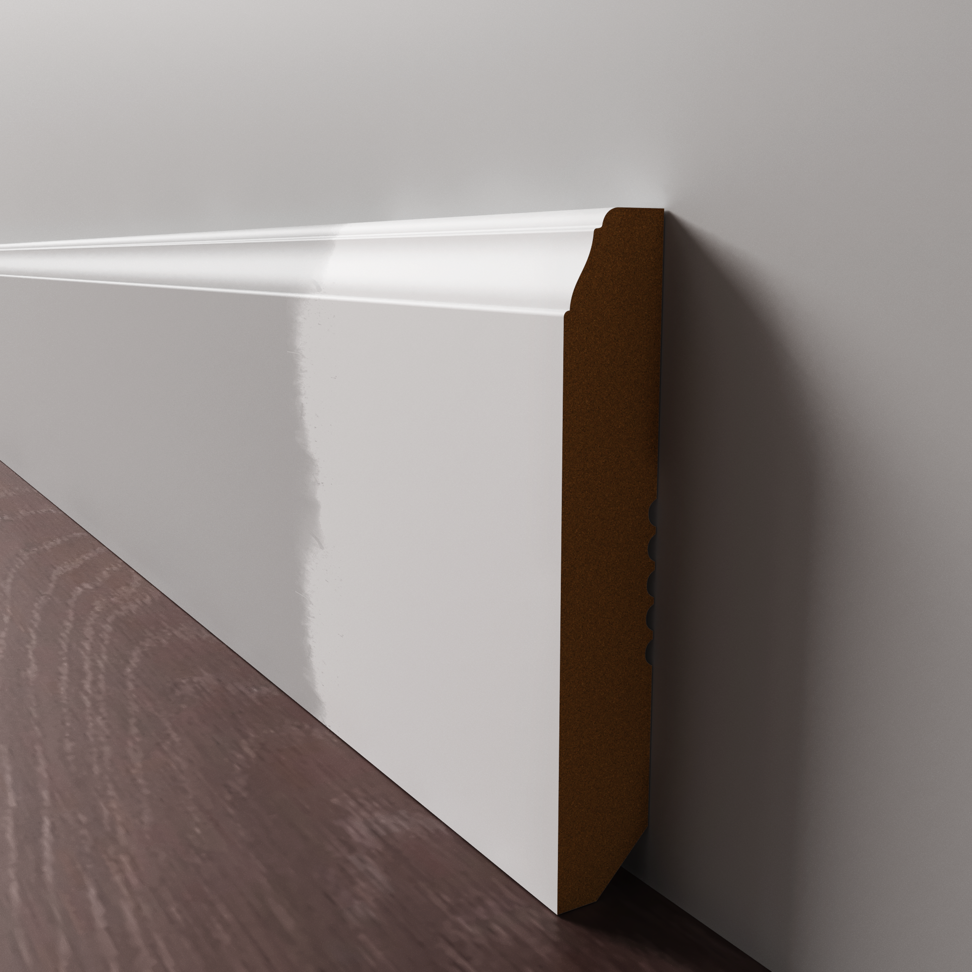 Напольный плинтус из МДФ обладает гладкой структурой, что делает его пригодным к окрашиванию в любой цвет на заказ по таблицам RAL и NCS. Срок покраски 3-5 дней.  Складская программа содержит грунтованные профили под покраску.