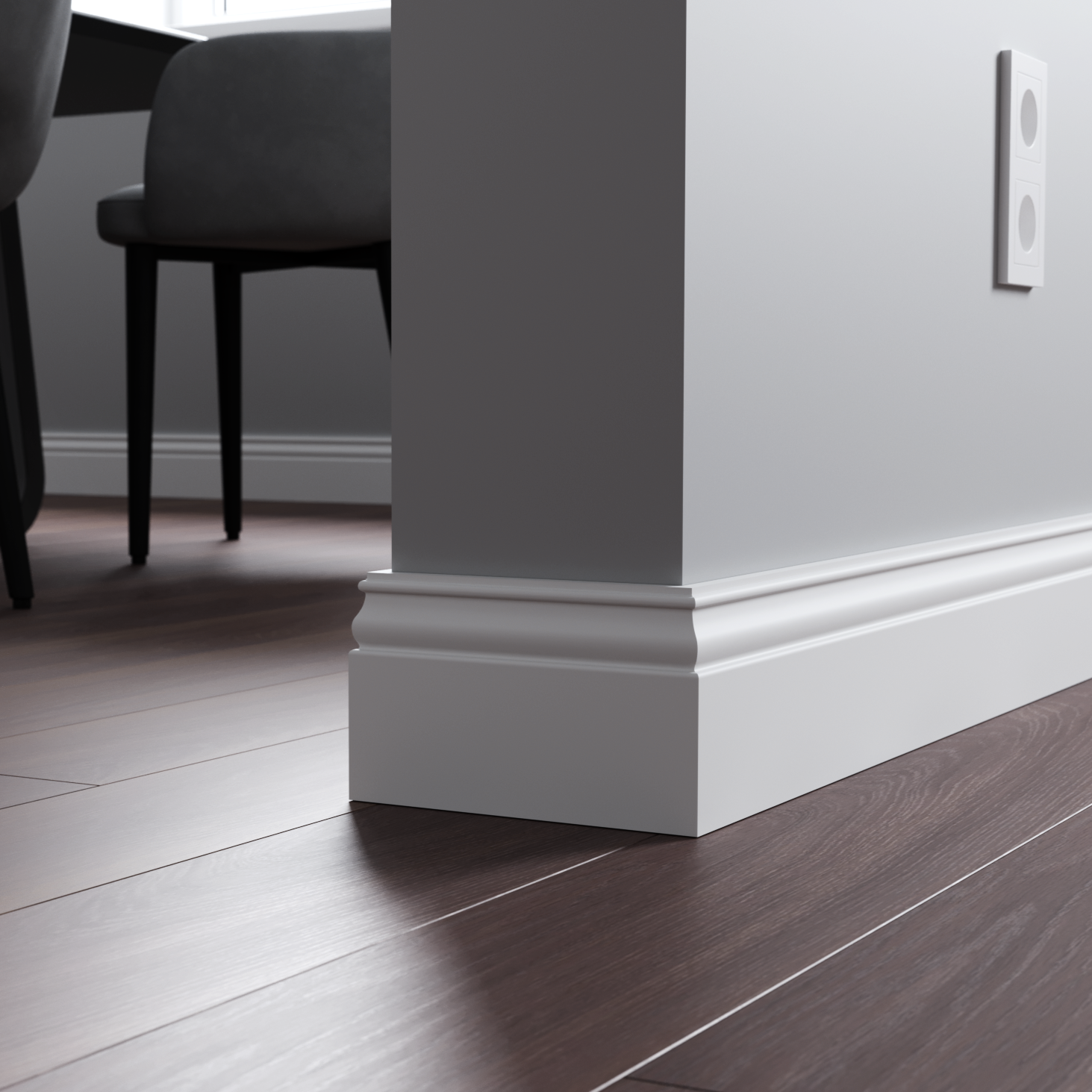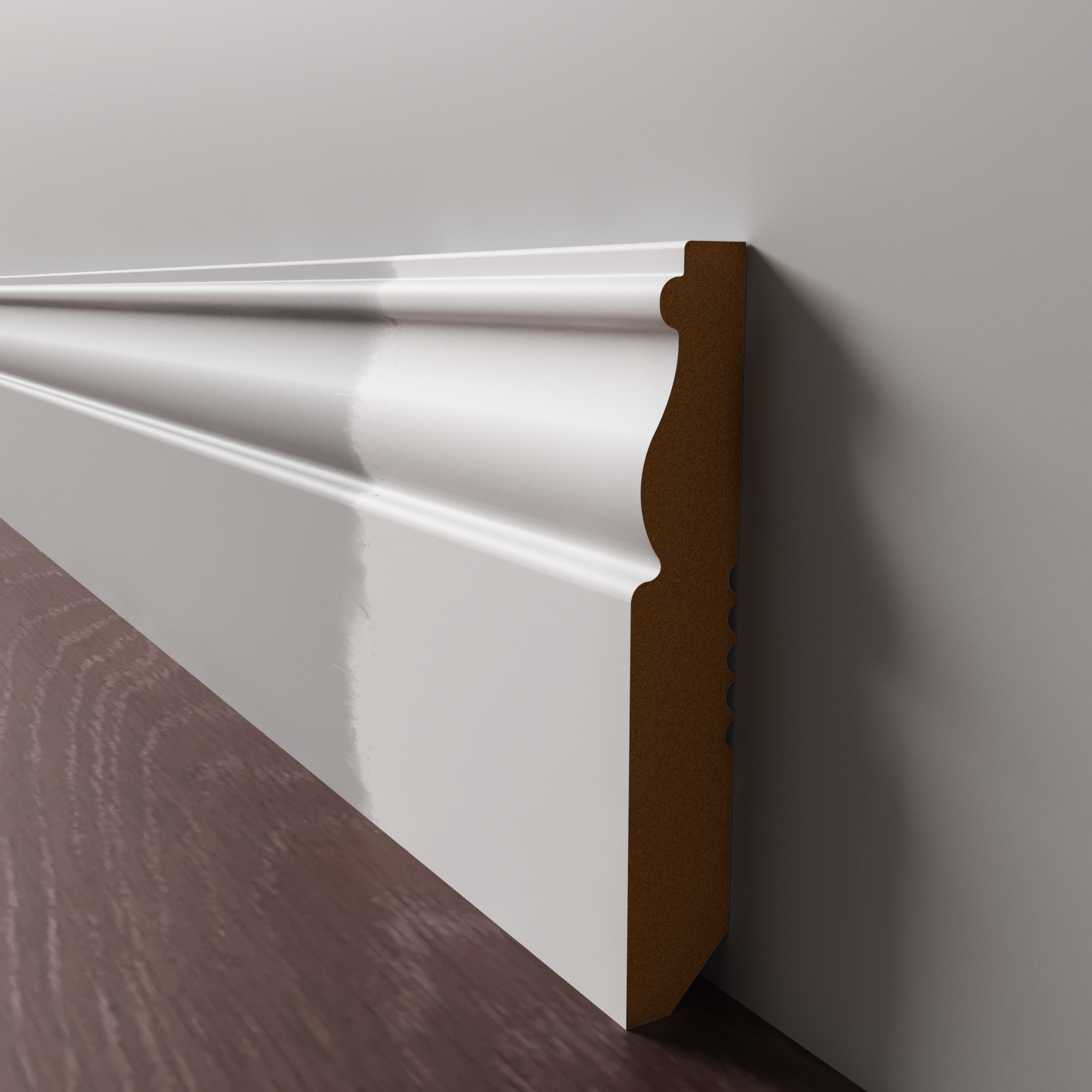 Напольный плинтус из МДФ обладает гладкой структурой, что делает его пригодным к окрашиванию в любой цвет на заказ по таблицам RAL и NCS. Срок покраски 3-5 дней.  Складская программа содержит грунтованные профили под покраску.