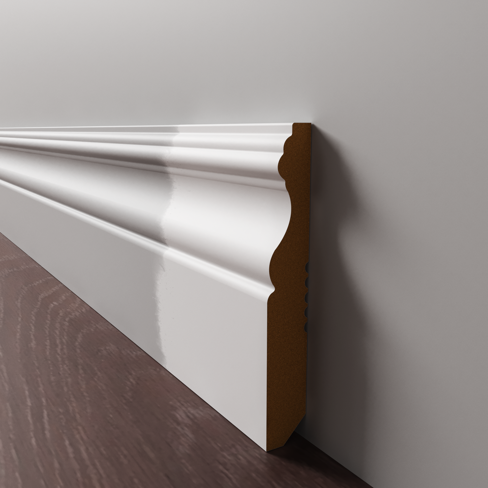 Напольный плинтус из МДФ обладает гладкой структурой, что делает его пригодным к окрашиванию в любой цвет на заказ по таблицам RAL и NCS. Срок покраски 3-5 дней.  Складская программа содержит грунтованные профили под покраску.