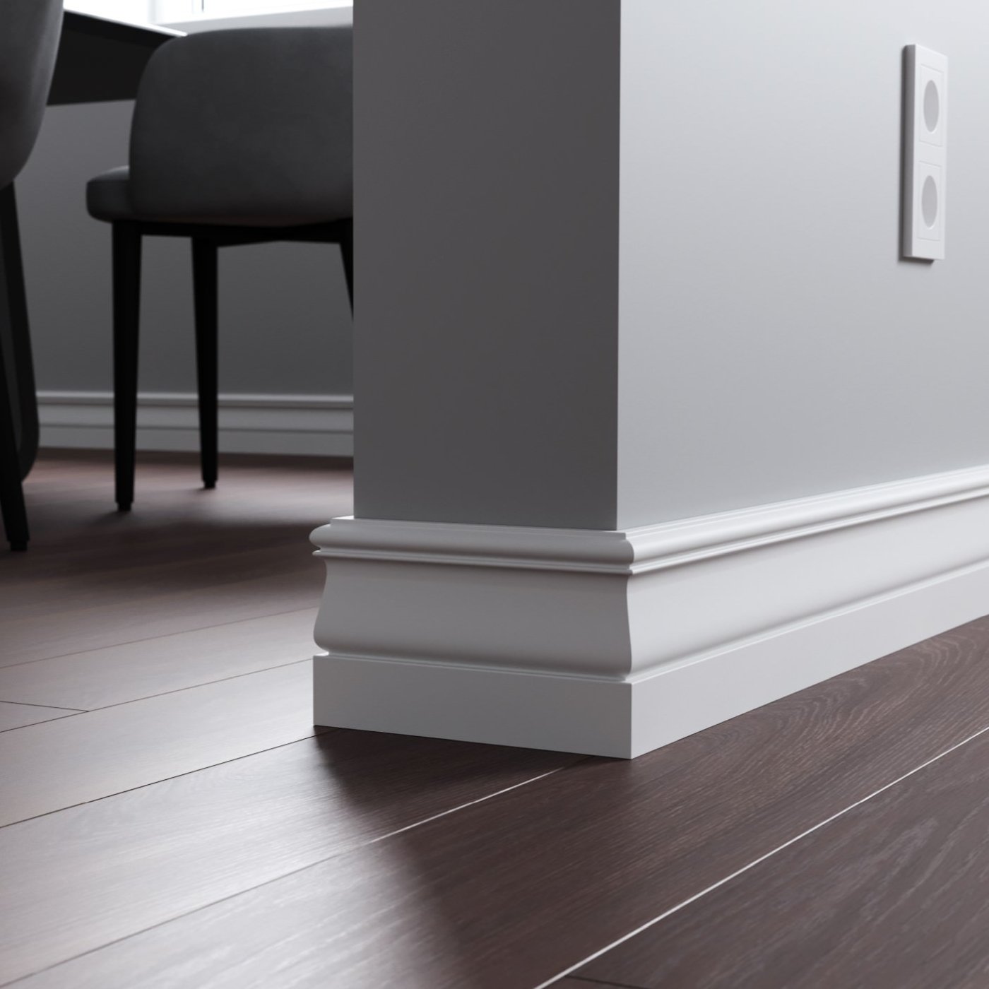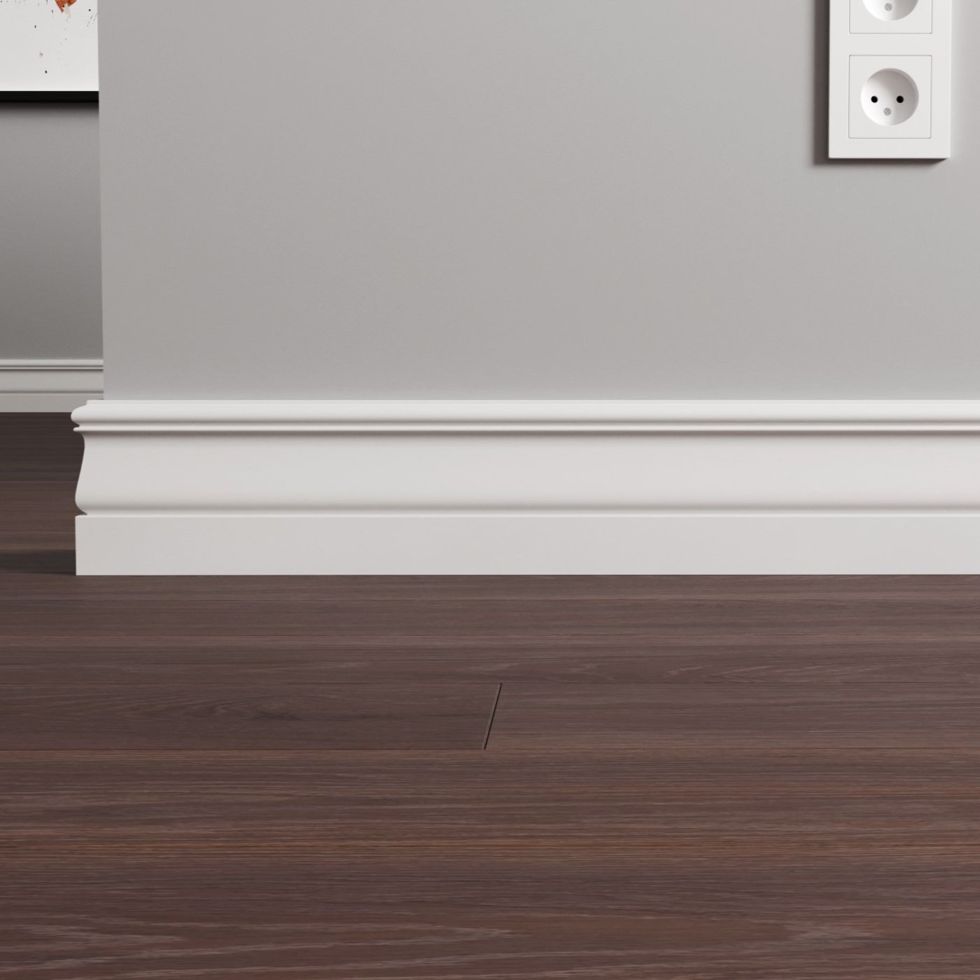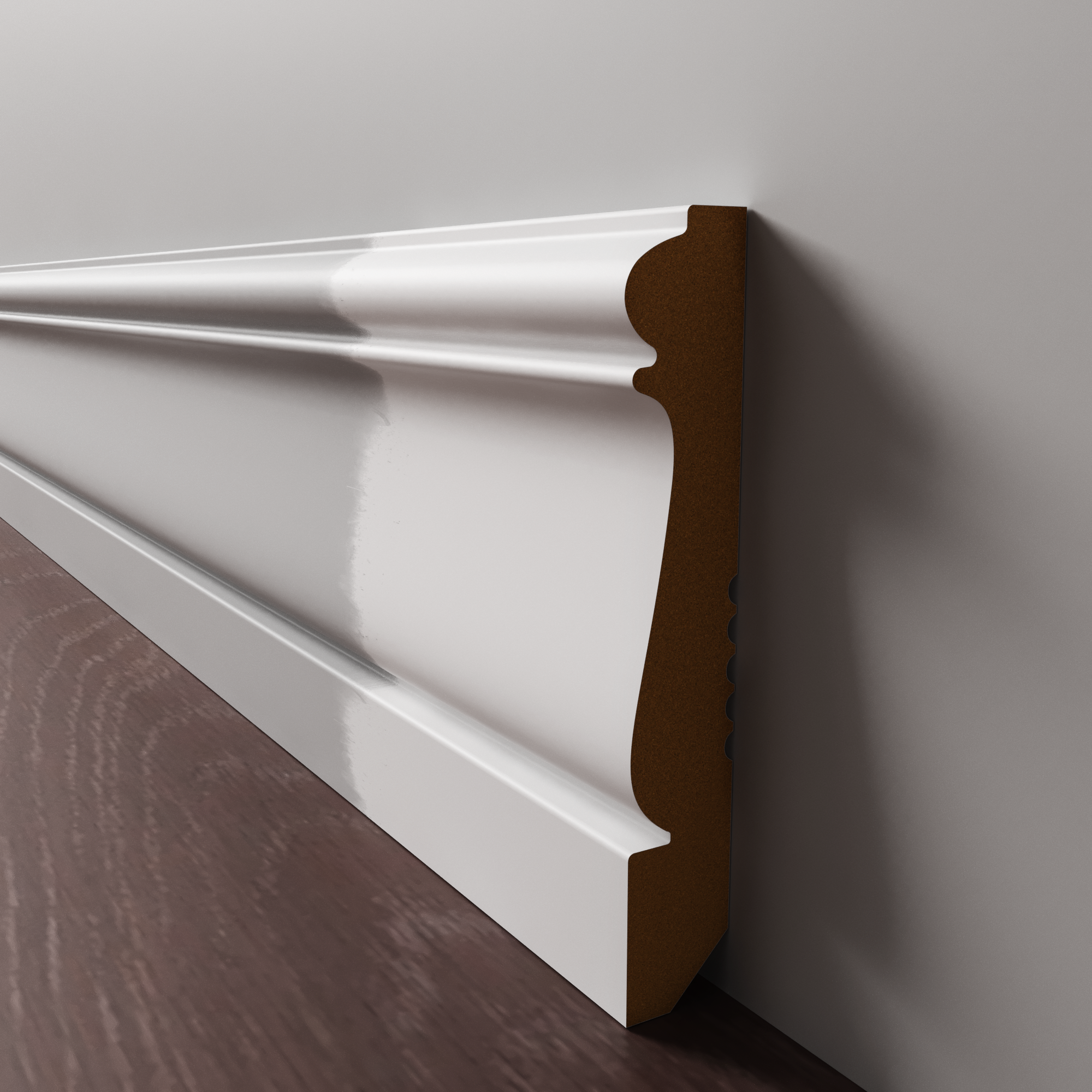 Напольный плинтус из МДФ обладает гладкой структурой, что делает его пригодным к окрашиванию в любой цвет на заказ по таблицам RAL и NCS. Срок покраски 3-5 дней.  Складская программа содержит грунтованные профили под покраску.