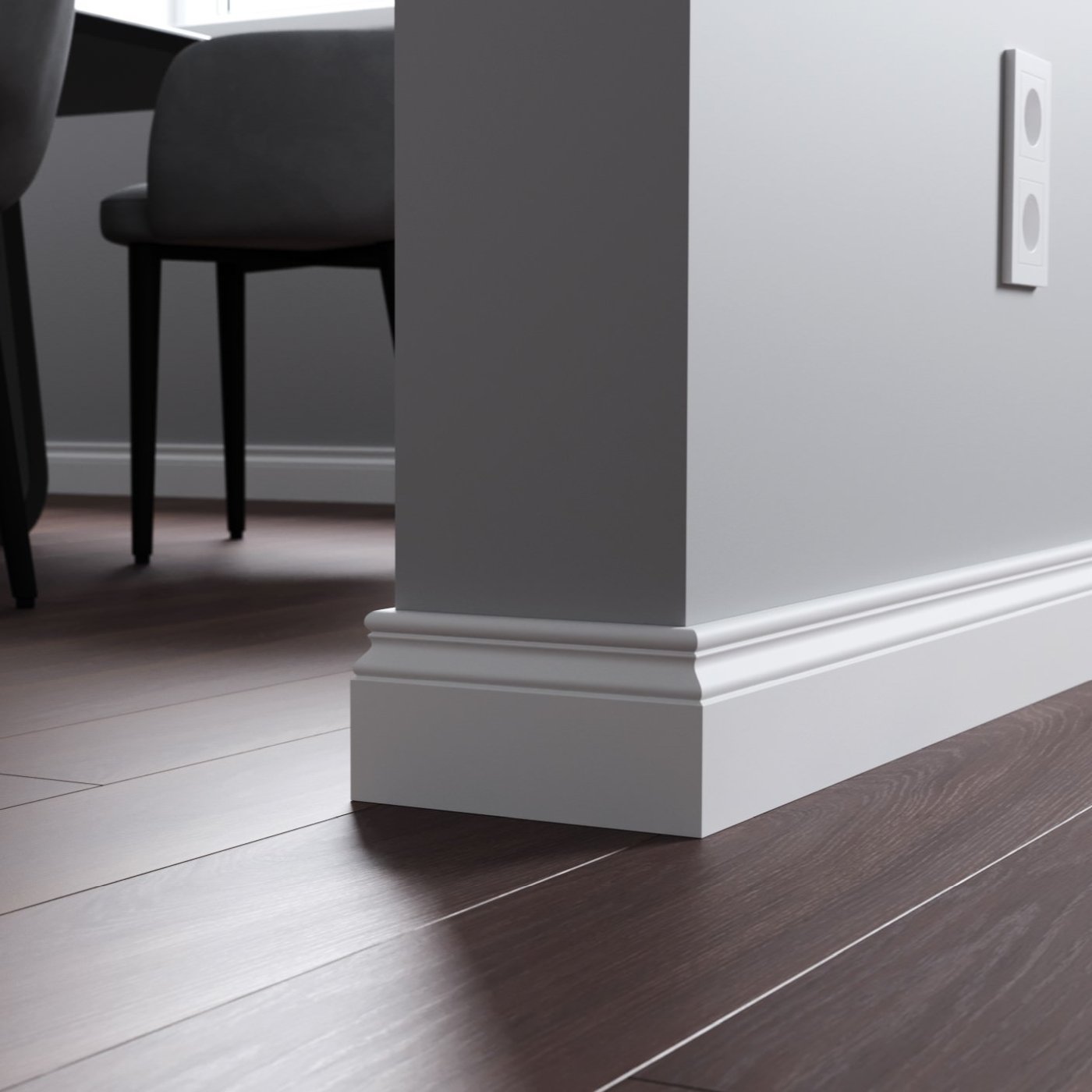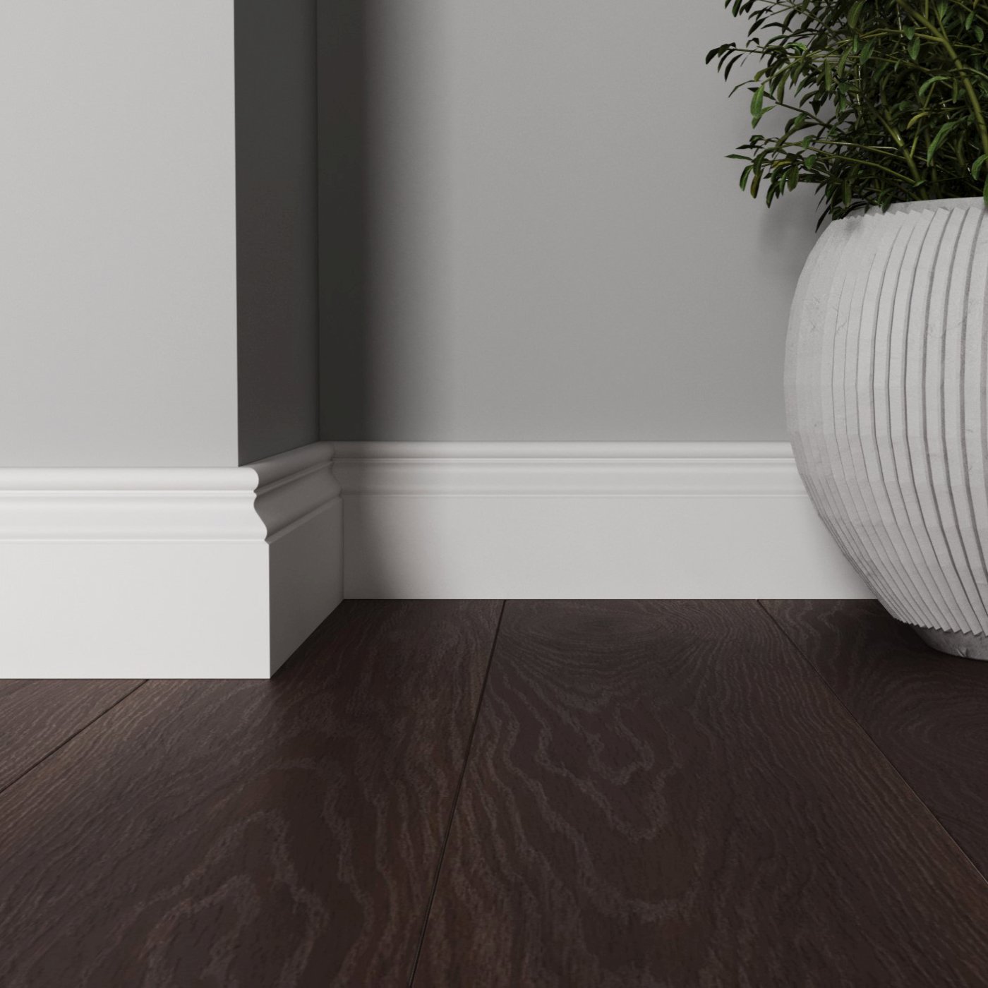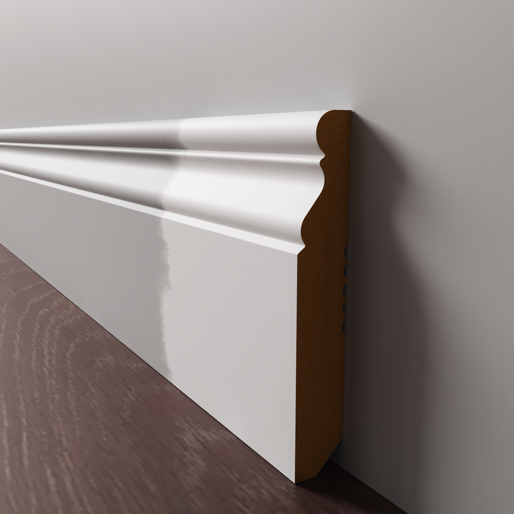 Напольный плинтус из МДФ обладает гладкой структурой, что делает его пригодным к окрашиванию в любой цвет на заказ по таблицам RAL и NCS. Срок покраски 3-5 дней.  Складская программа содержит грунтованные профили под покраску.