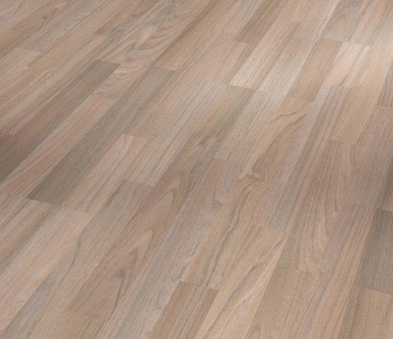 3-х полосный ламинат 32 класса серии Classic в декоре Тик океанский (Ocean Teak) серо-коричневого цвета от производителя Parador толщиной 8 мм, на замковой системе Safe-Lock PRO без фаски. Полуматовая поверхность с текстурой тика. Специальная основная плита Aqua-Proof позволяет использовать настил даже во влажных помещениях на систему теплых полов.