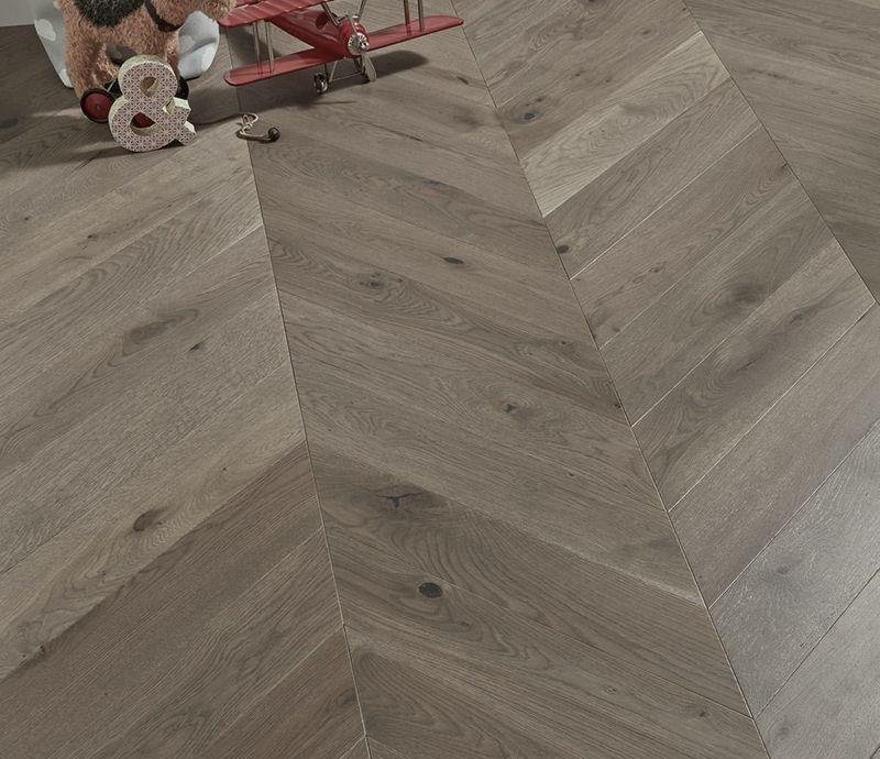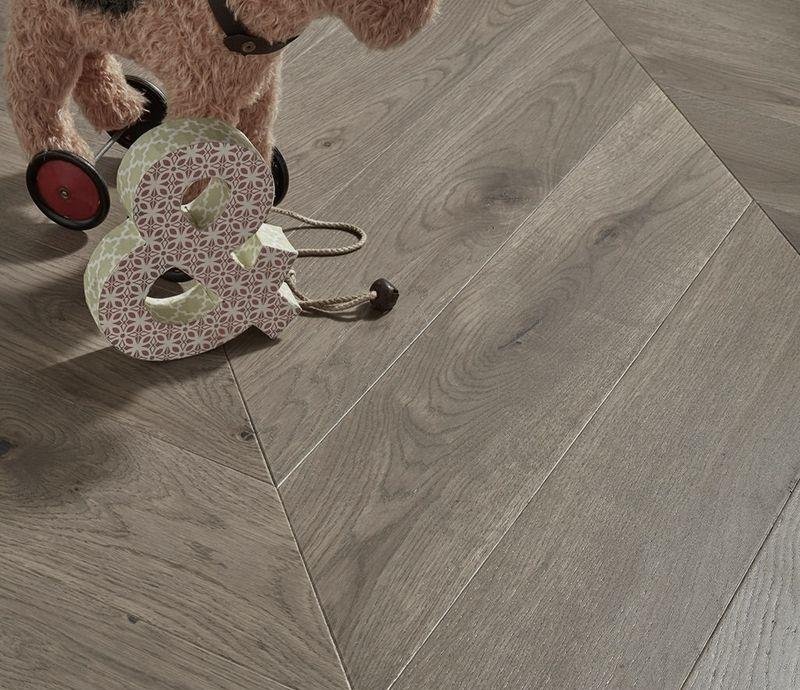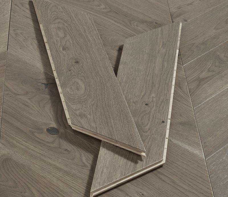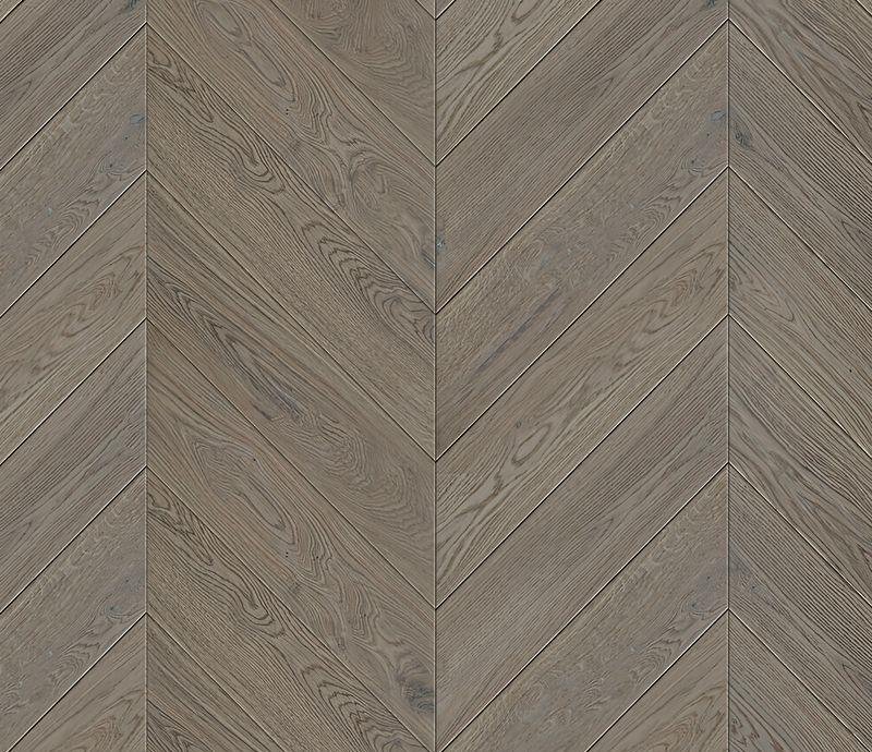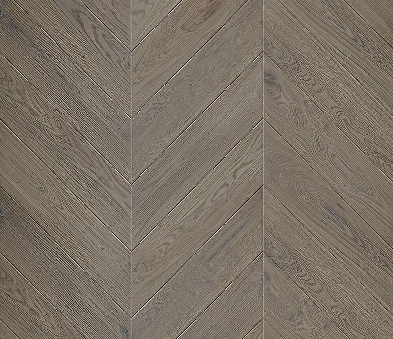 Инженерный паркет Kochanelli Desierto в декоре Дуб Альхибэ (Aljibe Oak) под французскую ёлочку 45° серо-коричневого цвета. Брашированные плашки с типом соединения "шип-паз" покрыты тонированным УФ-маслом и снабжены V-образной фаской по краям. Двухслойная конструкция состоит из основания и верхней ламели дуба 4 мм. Такая структура позволяет неоднократно реставрировать напольное покрытие методом повторного шлифования циклёвки и финишного покрытия маслом.