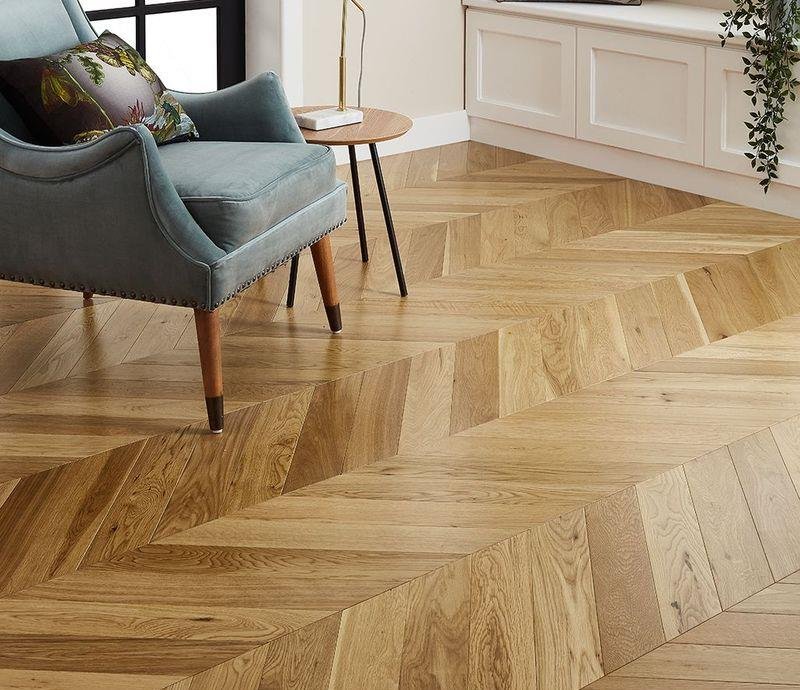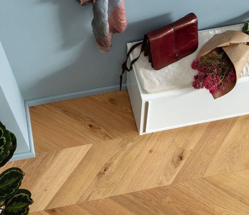 Инженерный паркет Kochanelli Desierto в декоре Дуб Натурале (Naturale Oak) под французскую ёлочку 45° золотистого цвета. Брашированные плашки с типом соединения "шип-паз" покрыты тонированным УФ-маслом и снабжены V-образной фаской по краям. Двухслойная конструкция состоит из основания и верхней ламели дуба 4 мм. Такая структура позволяет неоднократно реставрировать напольное покрытие методом повторного шлифования циклёвки и финишного покрытия маслом.