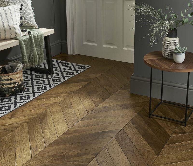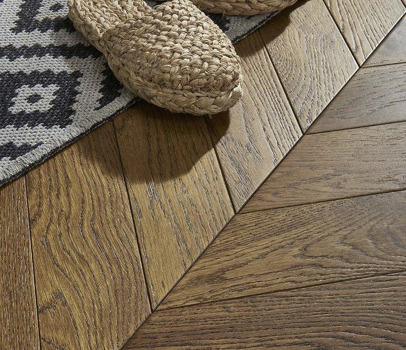 V-образная фаска по периметру доски выразительно выделяет каждую планку, подчеркивая натуральность напольного покрытия