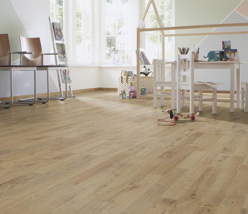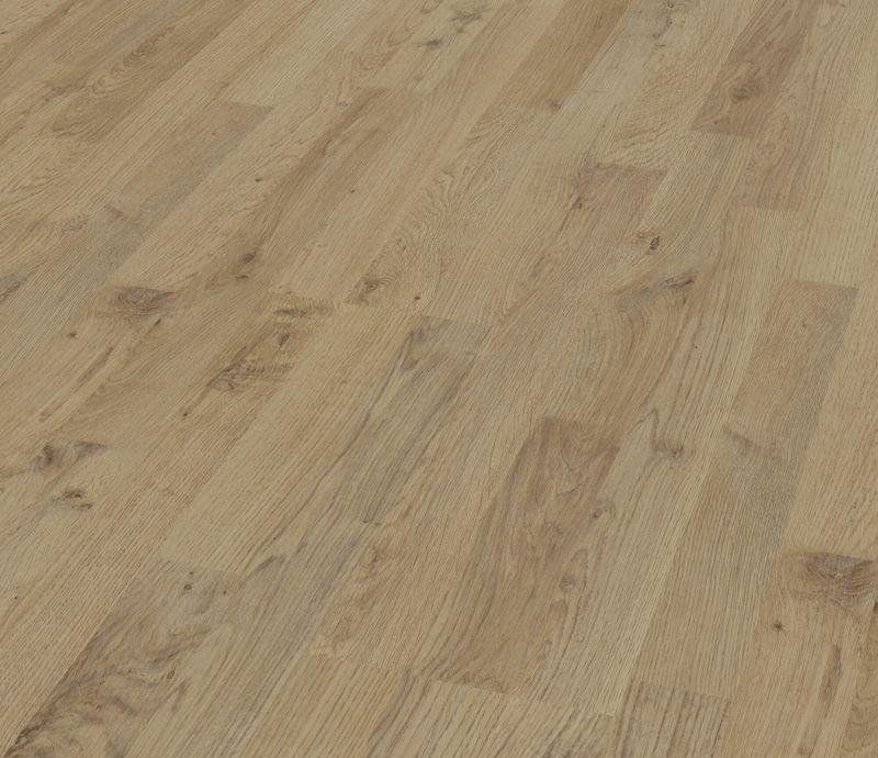 Серо-бежевый трехполосный ламинат 32 класса с матовой поверхностью под дерево. Планки декора D 4953 Дуб Плау снабжены замковой системой EXPRESS CLICK и не имеют фаски. Толщина 8 мм. Гарантия 25 лет.