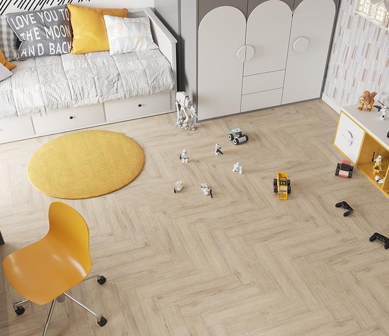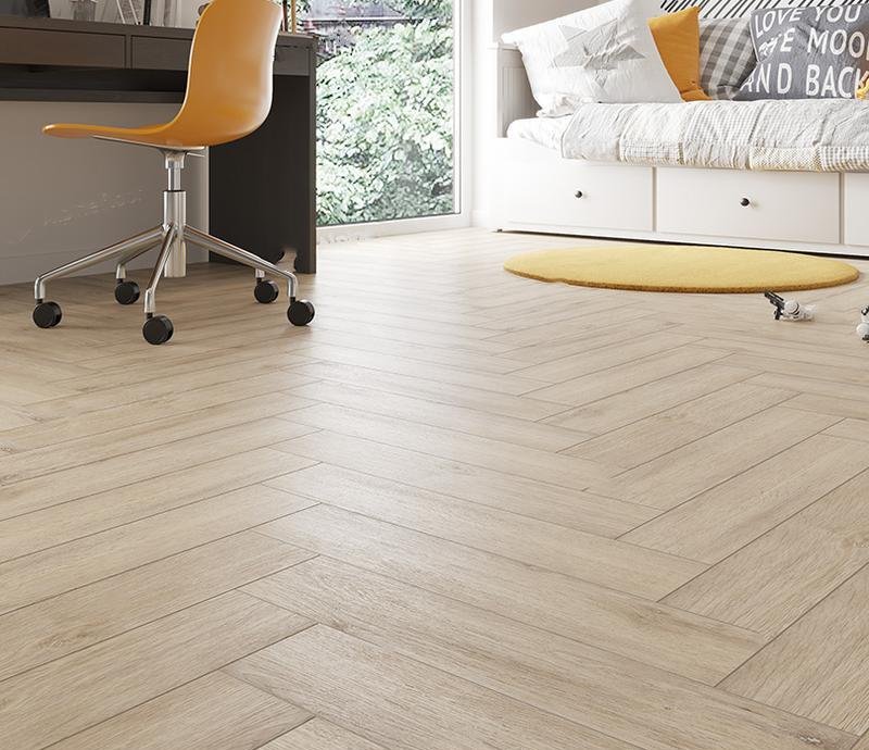Клеевой виниловый паркет ёлочка 43 класса Alpine Floor Parquet LVT в декоре Дуб Медиа (Media Oak) бежевого цвета с тисненной фактурой дерева. Небольшие планки форматом 590×118 мм толщиной 2,5 мм снабжены V фаской по периметру и покрыты защитным слоем. Особенностью винилового ламината Alpine Floor Parquet LVT ECO 16-20 Дуб Медиа в том, что данное покрытие можно укладывать как в дизайне английской ёлочки, так и прямым палубным вариантом.