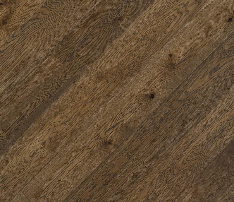 Однополосная паркетная доска из дуба слегка обработанная щеткой и покрытая коричневым УФ-маслом. Под воздействием ультрафиолетовых лучей цвет становиться более насыщенным. Характерны большие сучки, в том числе черные и зашпатлеванные. Встречаются заболонь и сердцевинные лучи.
