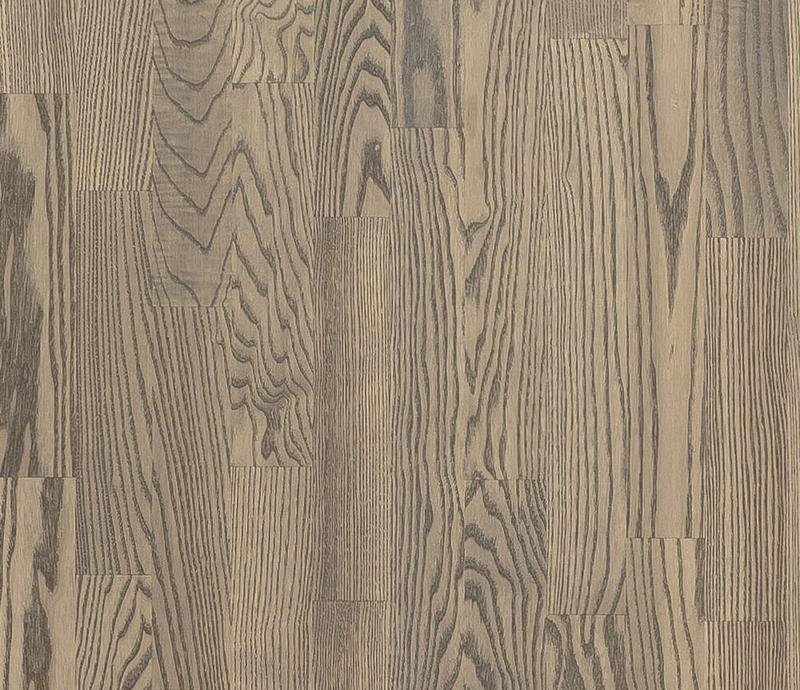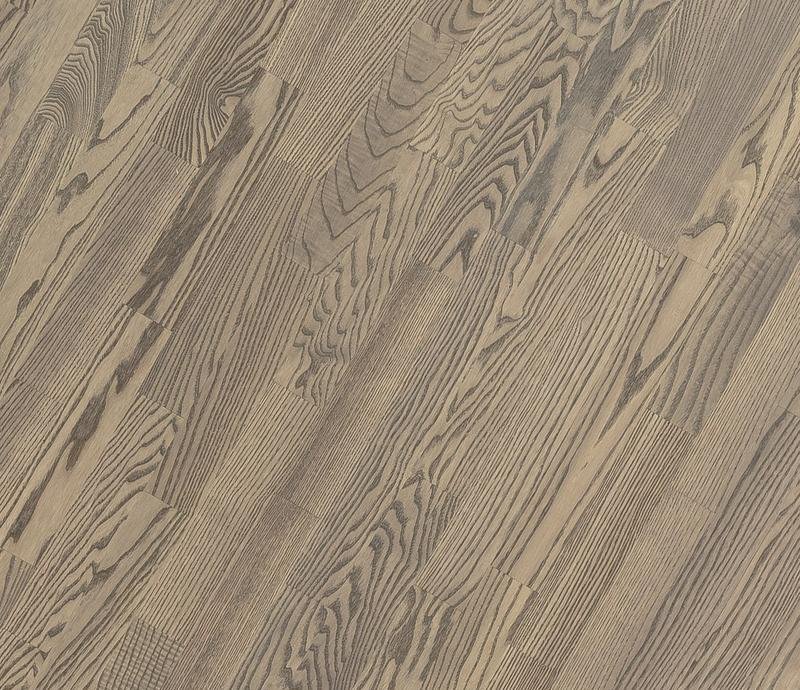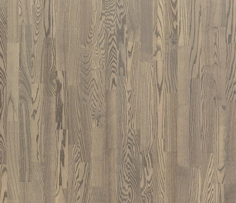 Трехполосный паркет из ясеня слегка обработан щеткой и покрыт серым маслом. Характерны существенные вариации цвета и небольшое количество сучков, в том числе черных и зашпатлеванных.