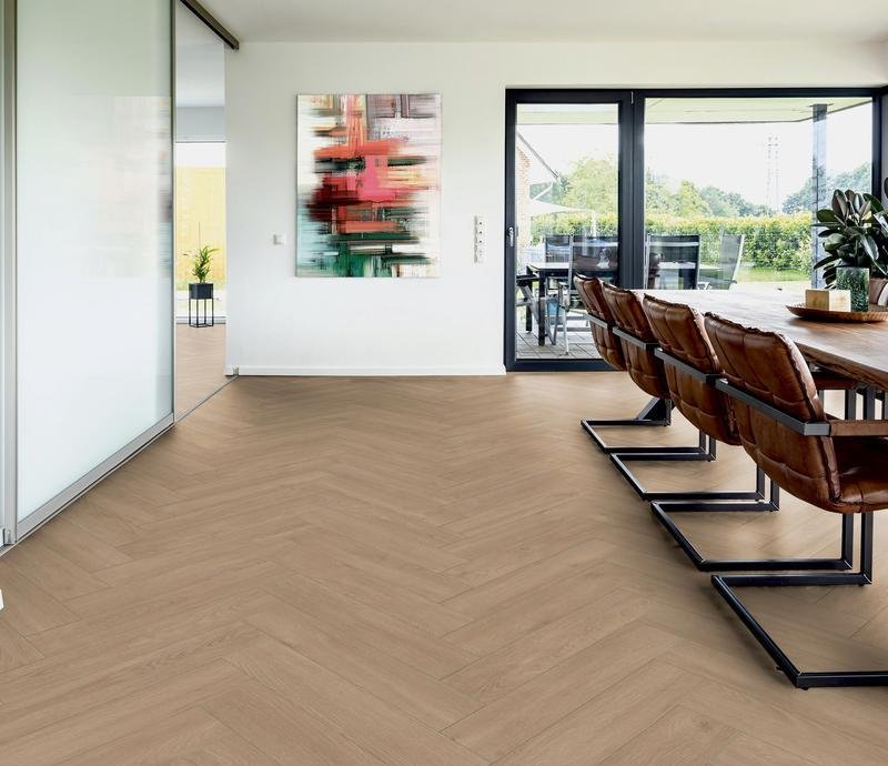 Ламинат под Английскую ёлочку 33 класса Herringbone Edition в декоре Дуб апартаментный (Oak Apartment) светло-коричневого цвета от производителя Ter Hurne толщиной 10 мм, на замковой системе SmartConnect HB, 5G с фаской по периметру. Напольное покрытие Herringbone Edition Дуб апартаментный (1101021808) продаётся упаковками по 10 планок размером 133×665 мм общей площадью 0,884 м².