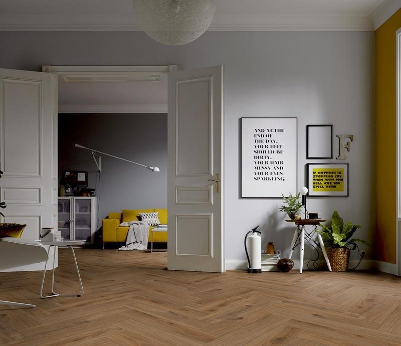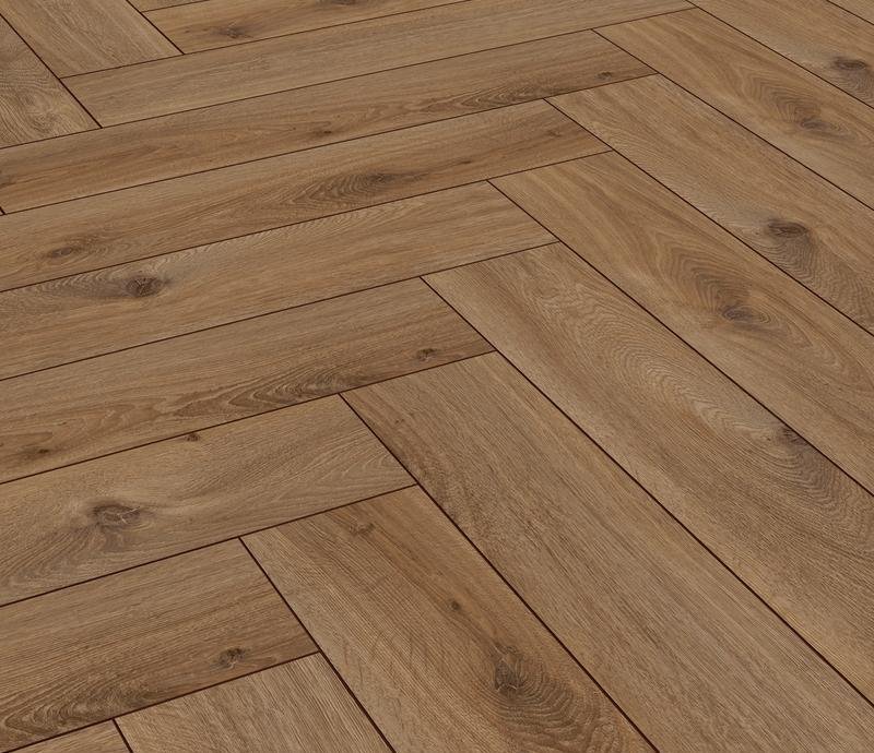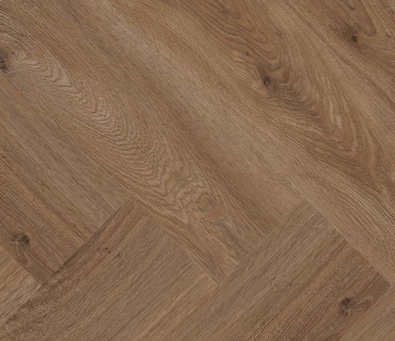 Ламинат под Английскую ёлочку 33 класса Herringbone Edition в декоре Дуб Кондоминимум (Oak Condo) коричневого цвета от производителя Ter Hurne толщиной 10 мм, на замковой системе SmartConnect HB, 5G с фаской по периметру. Напольное покрытие Herringbone Edition Дуб Кондоминимум (1101021803) продаётся упаковками по 10 планок размером 133×665 мм общей площадью 0,884 м².