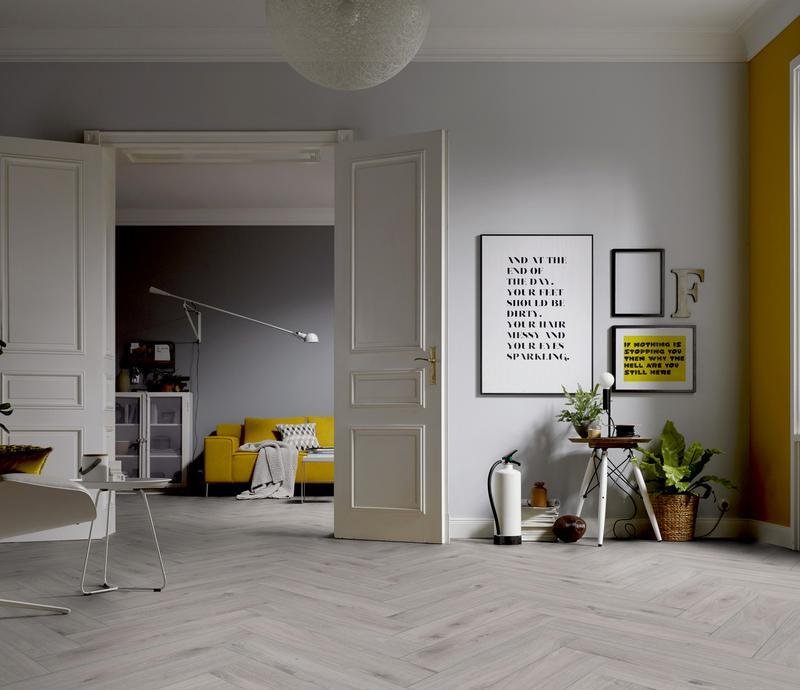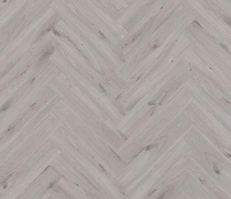 Ламинат под Английскую ёлочку 33 класса Herringbone Edition в декоре Дуб Иглу (Oak Igloo) светло-серого цвета от производителя Ter Hurne толщиной 10 мм, на замковой системе SmartConnect HB, 5G с фаской по периметру. Напольное покрытие Herringbone Edition Дуб Иглу (1101021801) продаётся упаковками по 10 планок размером 133×665 мм общей площадью 0,884 м².