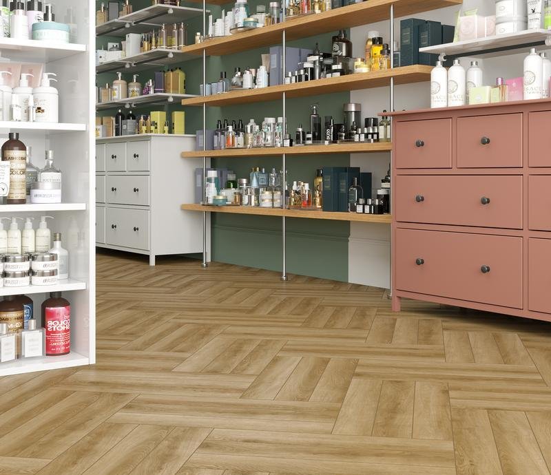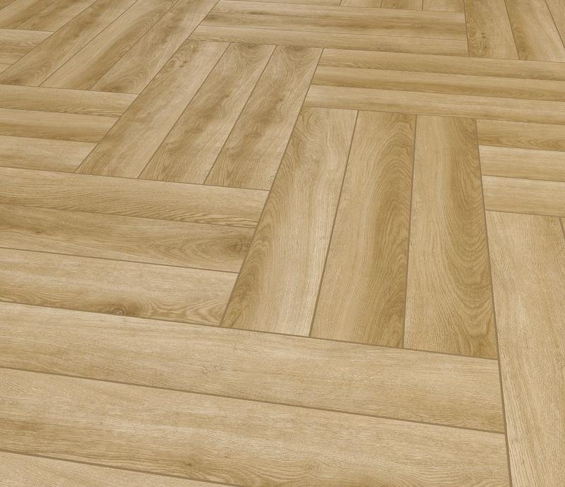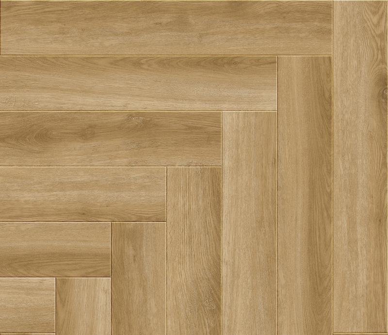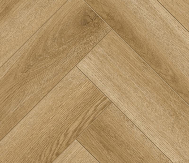 Водостойкий ламинат 33 класса Herringbone в декоре Дуб Эльзас светло-коричневого цвета от производителя Alpine Floor толщиной 8 мм, на замковой системе Click System с 4V фаской по периметру. Дизайн под ёлочку. Напольное покрытие Herringbone Дуб Эльзас (LF102-02) продаётся упаковками по 7 планок размером 606×101 мм общей площадью 2,2034 м².