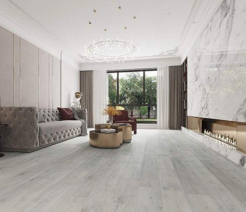 Влагостойкий виниловый SPC ламинат 42 класса Life Click в декоре Дуб Таити (Oak Tahiti) светло-серого цвета с фаской по периметру для плавающего и клеевого способа укладки, толщиной 3,5 мм от австрийского производителя EvoFloor. Дизайн выполнен под дерево