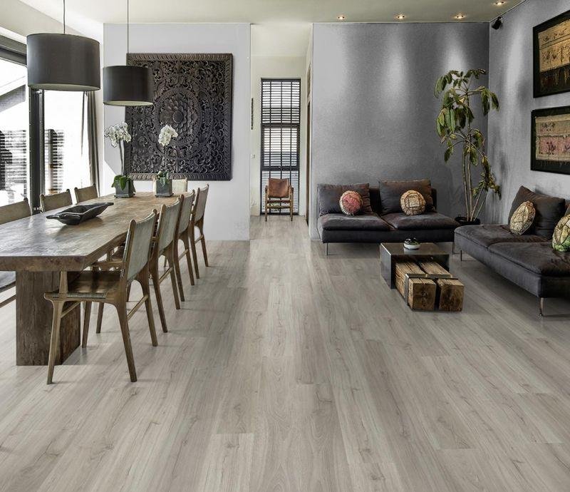 Влагостойкий виниловый пол 43 класса Luxury Tiles Impression в декоре Laponia светло-серого цвета от немецкого производителя Kahrs. Планки с V-образной фаской по периметру на замковой системе Click5Gi, толщиной 6 мм. Дизайн выполнен под деревянную доску в формате 220×1829 мм.