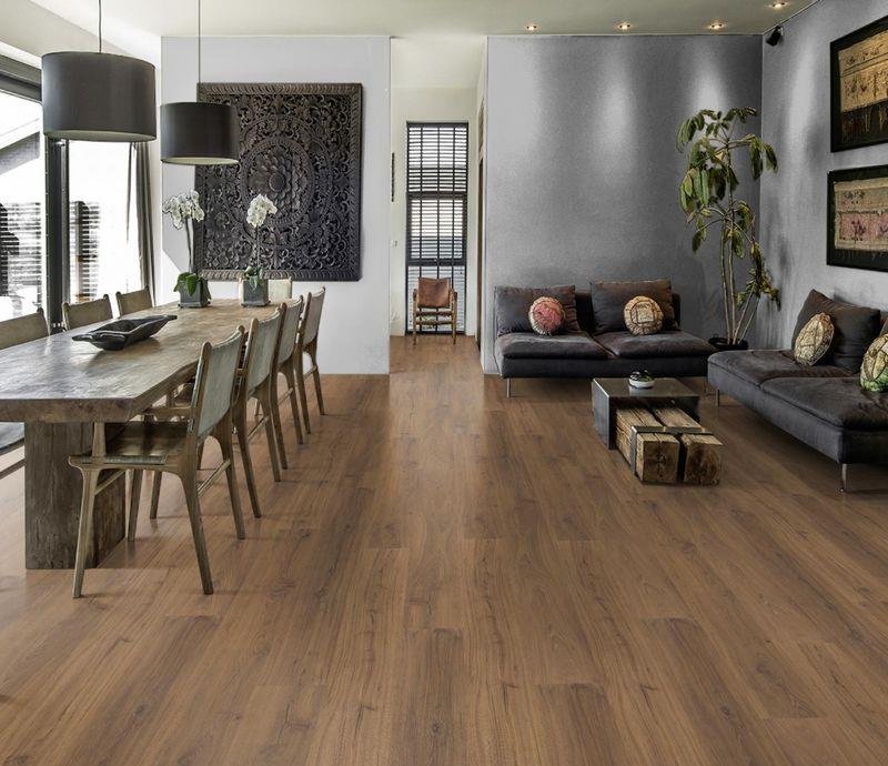 Влагостойкий виниловый пол 43 класса Luxury Tiles Impression в декоре Saham коричневого цвета от немецкого производителя Kahrs. Планки с V-образной фаской по периметру на замковой системе Click5Gi, толщиной 6 мм. Дизайн выполнен под деревянную доску в формате 220×1829 мм.
