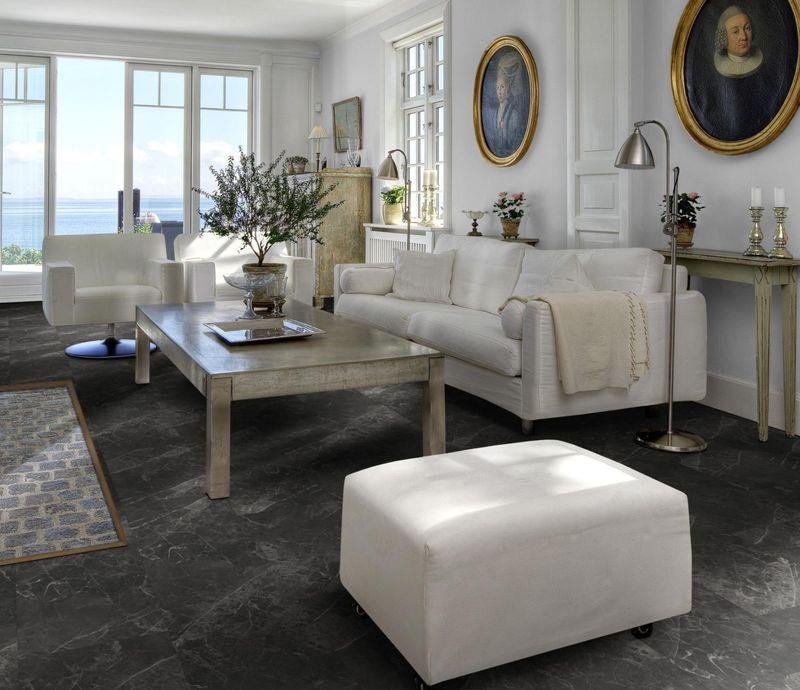 Влагостойкий виниловый пол 43 класса Luxury Tiles Impression в декоре Talung темно-серого цвета от немецкого производителя Kahrs. Планки с V-образной фаской по периметру на замковой системе Click5Gi, толщиной 6 мм. Дизайн выполнен под каменную плитку в формате 457×914 мм.