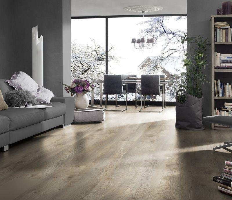 Светло-коричневый однополосный ламинат 33 класса с замковой системой 5G CLICK. Декор Kronotex Mammut Plus D 3669 Дуб Макро бежевый снабжен V-образной фаской по периметру. Толщина досок 10 мм. Гарантия 30 лет.