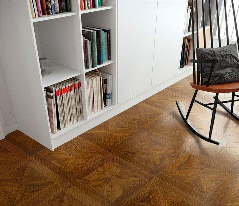 Инженерный модульный паркет Верона Дуб Луче (Verona Luce Oak) коньячного цвета от итальянского производителя «Kochanelli» с геометрическим узором, схож с наборным паркетом, но его укладка производится гораздо проще. Модули, размером 470×470 мм, имеют прочную двухслойную конструкцию. К основанию из влагостойкой фанеры, толщиной 11 мм, под большим давлением приклеивается ценный слой ламели натурального дуба.