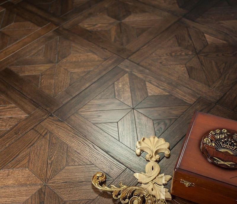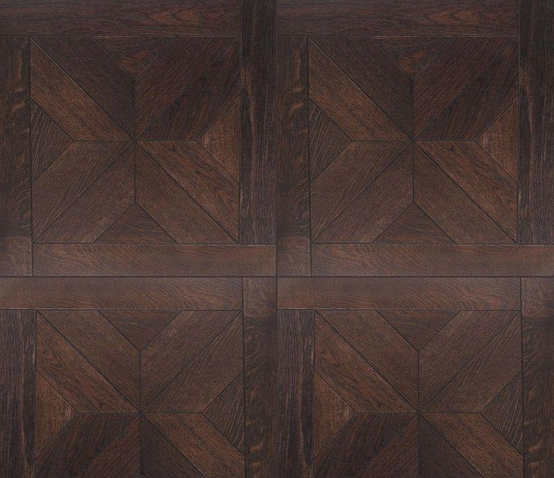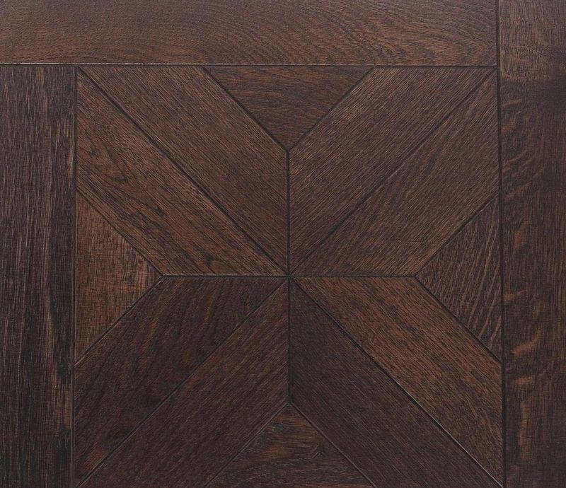 Инженерный модульный паркет Верона Дуб темный (Verona Dark Oak) темно-коричневого цвета от итальянского производителя «Kochanelli» с геометрическим узором, схож с наборным паркетом, но его укладка производится гораздо проще. Модули, размером 470×470 мм, имеют прочную двухслойную конструкцию. К основанию из влагостойкой фанеры, толщиной 11 мм, под большим давлением приклеивается ценный слой ламели натурального дуба.