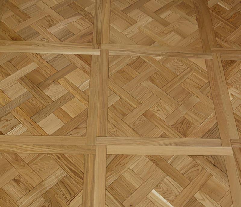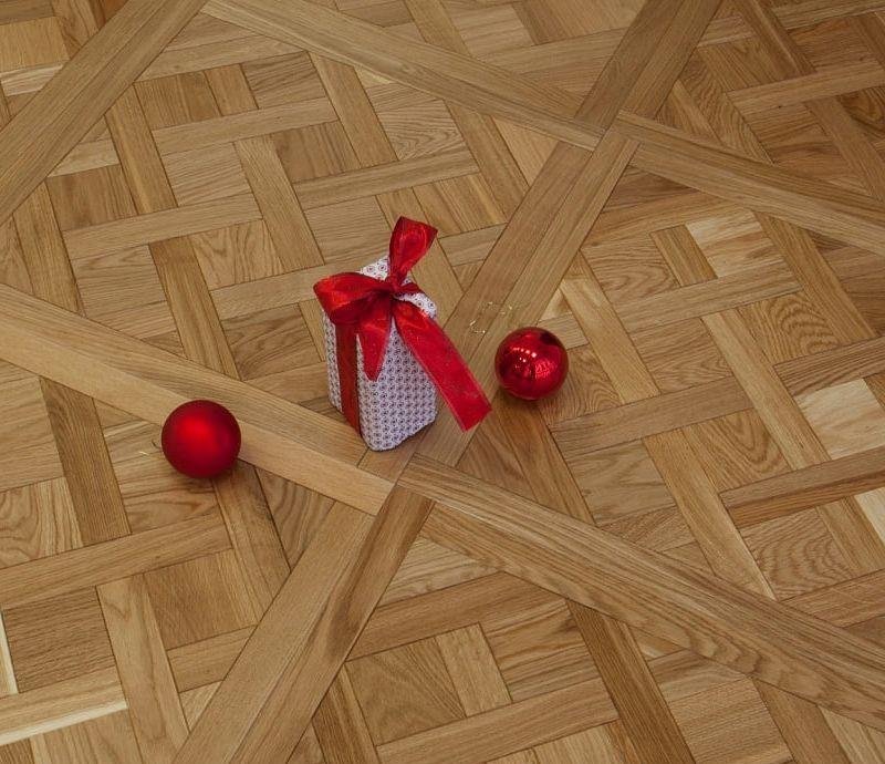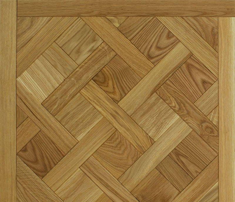 Узор «Версаль», представляет из себя набор элементов, каждый из которых имеет микро-фаску по периметру, тем самым имитируя штучный паркет и приобретает объём. Верхний слой из натурального дуба, толщиной 4 мм, подвергается специальной обработке «Браширование» подчёркивая текстуру древесины. Для тонировки и финишного покрытия используется износостойкий, экологически чистый тонирующий состав карамельного цвета и покрывается УФ-маслом.