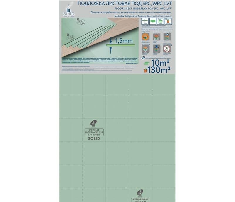 Базовая листовая подложка под замковые кварц-виниловые напольные покрытия и плитку ПВХ (SPC, WPC, LVT) Solid 1,5 мм изготавливается методом вспенивания полистирола, имеет жесткую структуру и не содержит вредных для организма человека веществ. Такая подложка выравнивает неровности поверхности до 0,8 мм, является прочной и стабильной основой под ламинированные полы, удобна при работе даже с диагональной укладкой. Подложка из экструдированного полистирола Solid 1,5 мм обладает идеальными гидроизоляционными свойствами. Solid 1,5 мм будет служить долгие годы, структура данного материала не разрушается от механического давления и поэтому со временем не теряет своих высоких теплоизолирующих и звукоизолирующих свойств.
