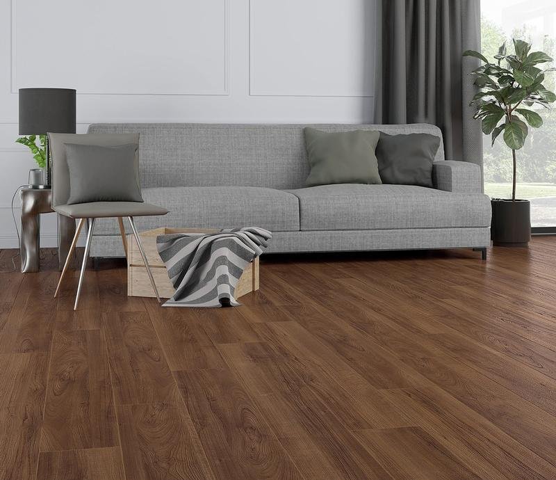 Водостойкий ламинат 32 класса Premium в декоре Орех тёмно-коричневого цвета от производителя Alpine Floor толщиной 10 мм, на замковой системе Valinge Click с 4V фаской по периметру. Синхронное тиснение в регистр с текстурой дуба. Напольное покрытие Premium Орех (P1004) продаётся упаковками по 7 планок размером 1380×190 мм общей площадью 1,84 м2.