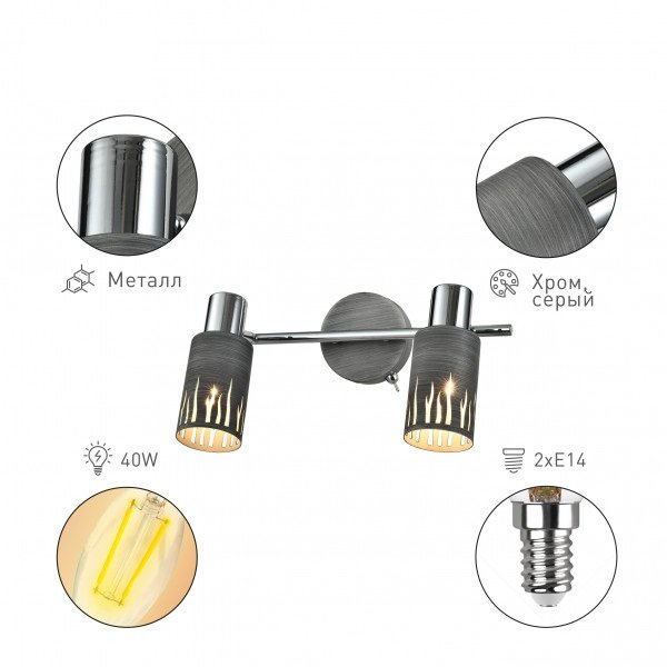 Замечательная модель 3123-312 со встроенным выключателем от итальянской компании Rivoli относится к коллекции Lethe и отлично подойдет для установки на потолок, на стену в гостиной, оформленной в стиле модерн. Спот Rivoli Lethe 3123-312 Б0055654 с цилиндрическими плафонами осветит помещение площадью 6 кв. м. Производитель Rivoli рекомендует использовать для устройства светодиодные лампы с цоколем E14 и мощностью 40 W. Прибор произведен с использованием материала: металл и может использоваться для натяжного потолка. Основным цветом товара является Хромовый, Серебристо-стальной и Серый. Спот 3123-312 Б0055654 продается по цене 5219 руб. Торопитесь сделать заказ в интернет-магазине Top Otdelka.