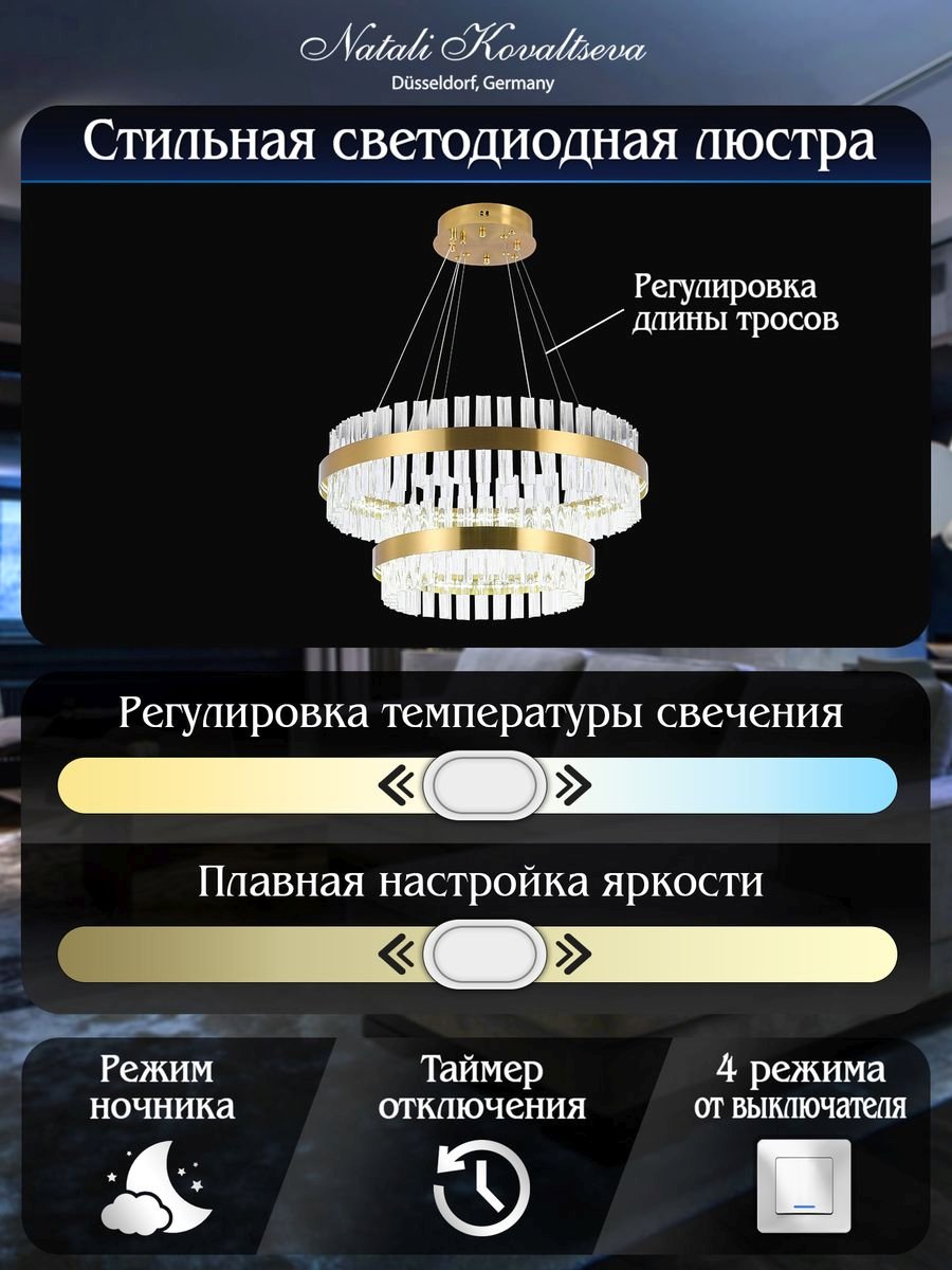 Утонченная модель Innovation Style 83004 от немецкой компании Natali Kovaltseva относится к коллекции Smart Нимбы и отлично подойдет для установки на потолок в гостиной, оформленной в стиле модерн. Подвесной светодиодный светильник Natali Kovaltseva Smart Нимбы Innovation Style 83004 с цилиндрическими плафонами осветит помещение площадью 28 кв. м. холодным светом. Осветительный элемент встроен в конструкцию и не требует приобретения дополнительных лампочек. Прибор произведен с использованием материалов: хрусталь и металл и может использоваться для натяжного потолка. В комплект поставки входит пульт дистанционного управления. Основным цветом товара является Золотой и Прозрачный. Подвесной светодиодный светильник Innovation Style 83004 с диммером продается по цене 24747 руб, с дисконтом 28% - ваша выгода при покупке составит 9677 руб. Торопитесь сделать заказ в интернет-магазине Top Otdelka.