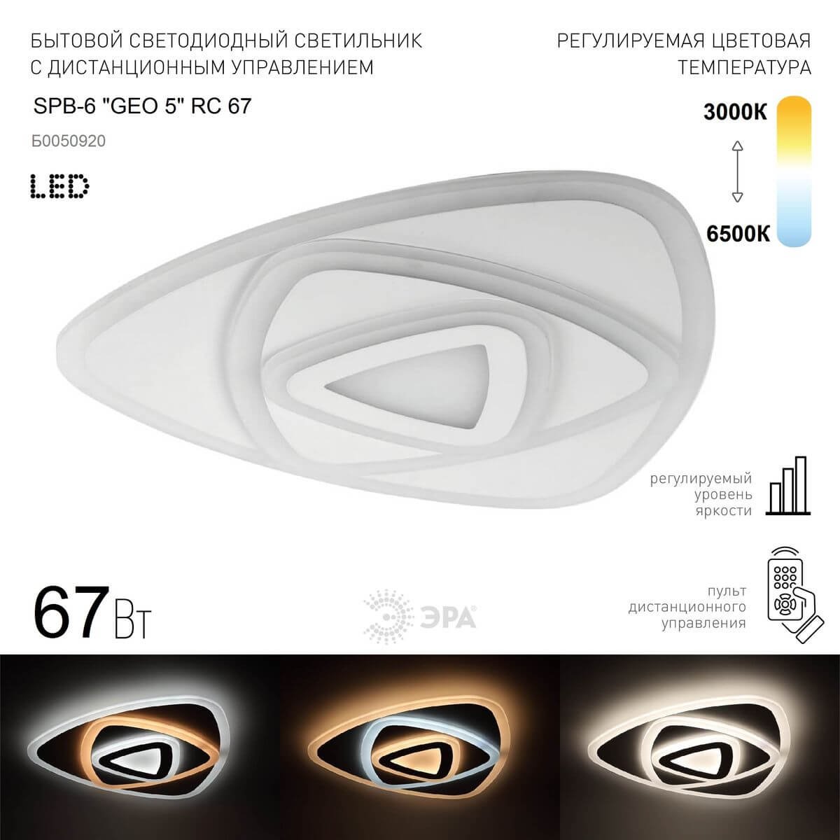 Изумительная модель SPB-6 Geo 5 RC 67 от российской компании ЭРА относится к коллекции Geo с ДУ и отлично подойдет для установки на низкий потолок спальни, оформленной в стиле хай-тек. Потолочный светодиодный светильник ЭРА Geo с ДУ SPB-6 Geo 5 RC 67 Б0050920 с треугольными плафонами осветит помещение площадью 20 кв. м. холодным светом. Осветительный элемент встроен в конструкцию и не требует приобретения дополнительных лампочек. Прибор произведен с использованием материалов: пластик, металл и акрил и может использоваться для натяжного потолка. В комплект поставки входит пульт дистанционного управления. Основным цветом товара является Белый. Потолочный светодиодный светильник SPB-6 Geo 5 RC 67 Б0050920 с диммером продается по цене 6927 руб. Торопитесь сделать заказ в интернет-магазине Top Otdelka.