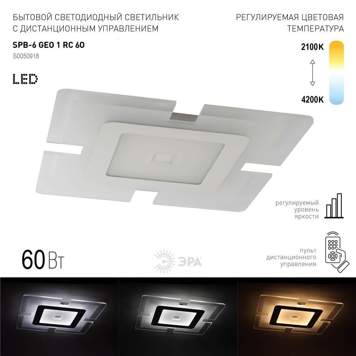 Изумительная модель SPB-6 Geo 1 RC 60 от российской компании ЭРА относится к коллекции Geo с ДУ и отлично подойдет для установки на низкий потолок спальни, оформленной в стиле хай-тек. Потолочный светодиодный светильник ЭРА Geo с ДУ SPB-6 Geo 1 RC 60 Б0050918 с квадратными плафонами осветит помещение площадью 18 кв. м. холодным светом. Осветительный элемент встроен в конструкцию и не требует приобретения дополнительных лампочек. Прибор произведен с использованием материалов: пластик, металл и акрил и может использоваться для натяжного потолка. В комплект поставки входит пульт дистанционного управления. Основным цветом товара является Белый. Потолочный светодиодный светильник SPB-6 Geo 1 RC 60 Б0050918 с диммером продается по цене 6927 руб. Торопитесь сделать заказ в интернет-магазине Top Otdelka.