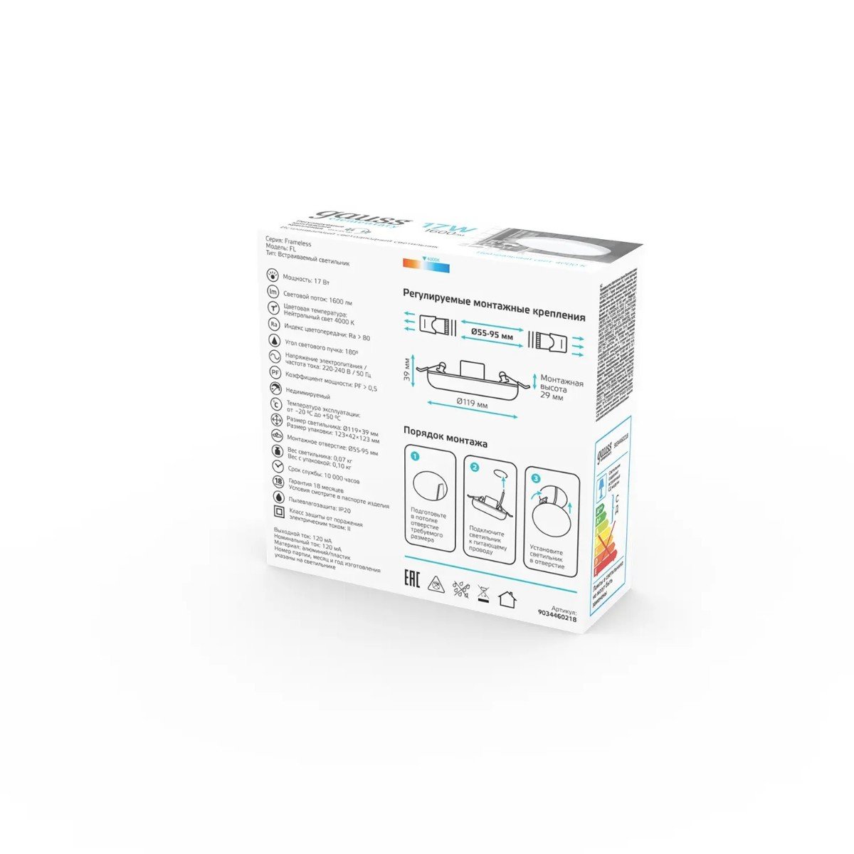 Утонченная модель 9034460218 от российской компании Gauss относится к коллекции Adjustable Frameless и отлично подойдет для установки на потолок офиса, оформленном в современном стиле. Осветительный элемент встроен в конструкцию и не требует приобретения дополнительных лампочек. Прибор произведен с использованием материалов: металл, алюминий и пластик. Основным цветом товара является Белый. Встраиваемый светодиодный светильник Elementary 9034460218 продается по цене 495 руб. Торопитесь сделать заказ в интернет-магазине Top Otdelka.