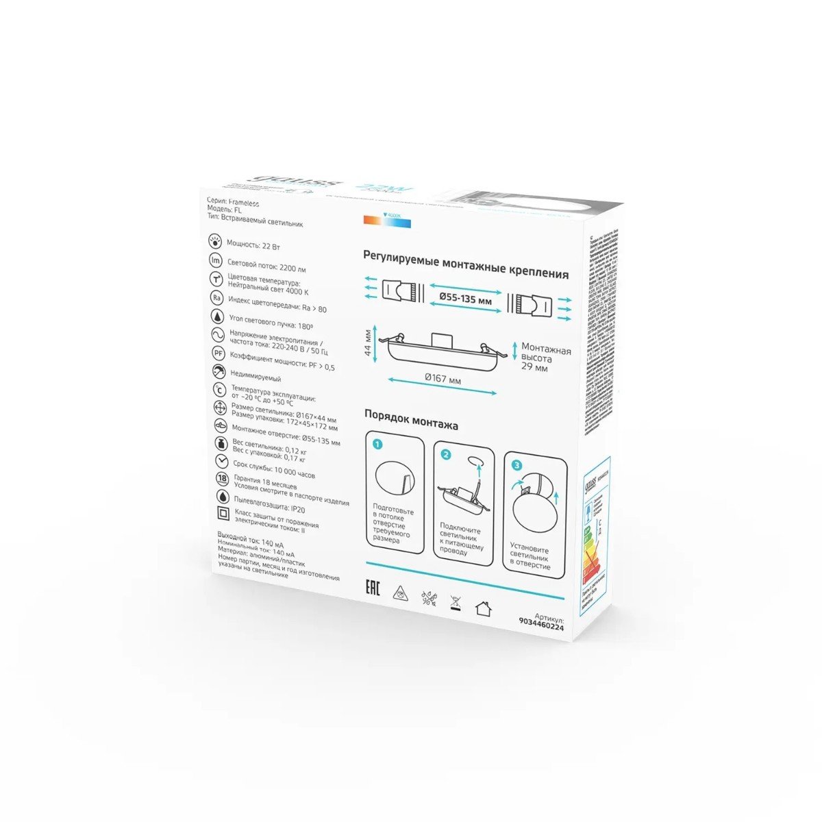 Невероятная модель 9034460224 от российской компании Gauss относится к коллекции Adjustable Frameless и отлично подойдет для установки на потолок офиса, оформленном в современном стиле. Осветительный элемент встроен в конструкцию и не требует приобретения дополнительных лампочек. Прибор произведен с использованием материалов: металл, алюминий и пластик. Основным цветом товара является Белый. Встраиваемый светодиодный светильник Elementary 9034460224 продается по цене 735 руб. Торопитесь сделать заказ в интернет-магазине Top Otdelka.