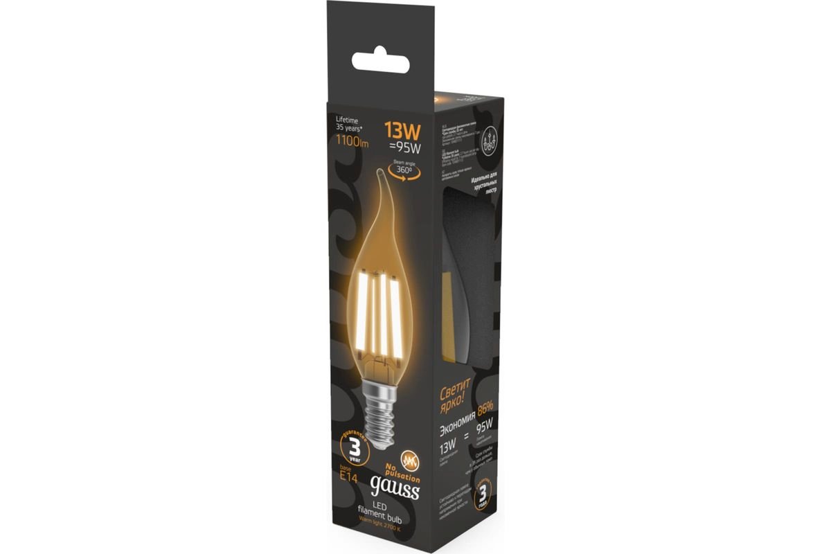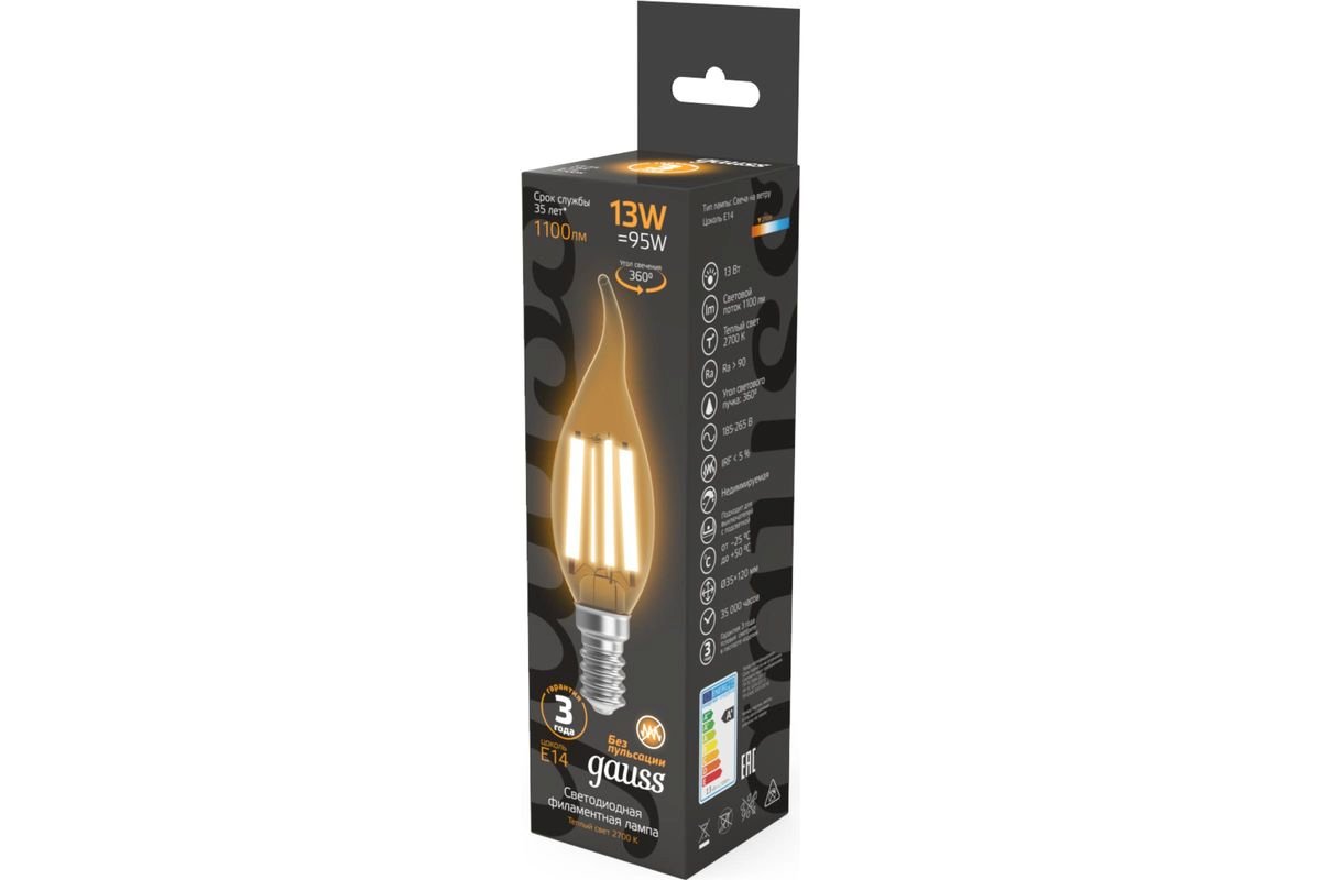 Светодиодная лампочка в форме свечи на ветру с цоколем E14 и размерами 120 мм по высоте и диаметром в 35 мм обладает мощностью в 13 W, благодаря чему она может осветить 4.3 кв. м. Цветовая температура – 2700 К, т.е. теплый свет, создающий атмосферу уюта. Изделие рассчитано на использование в сети с переменным напряжением в 220-240В.