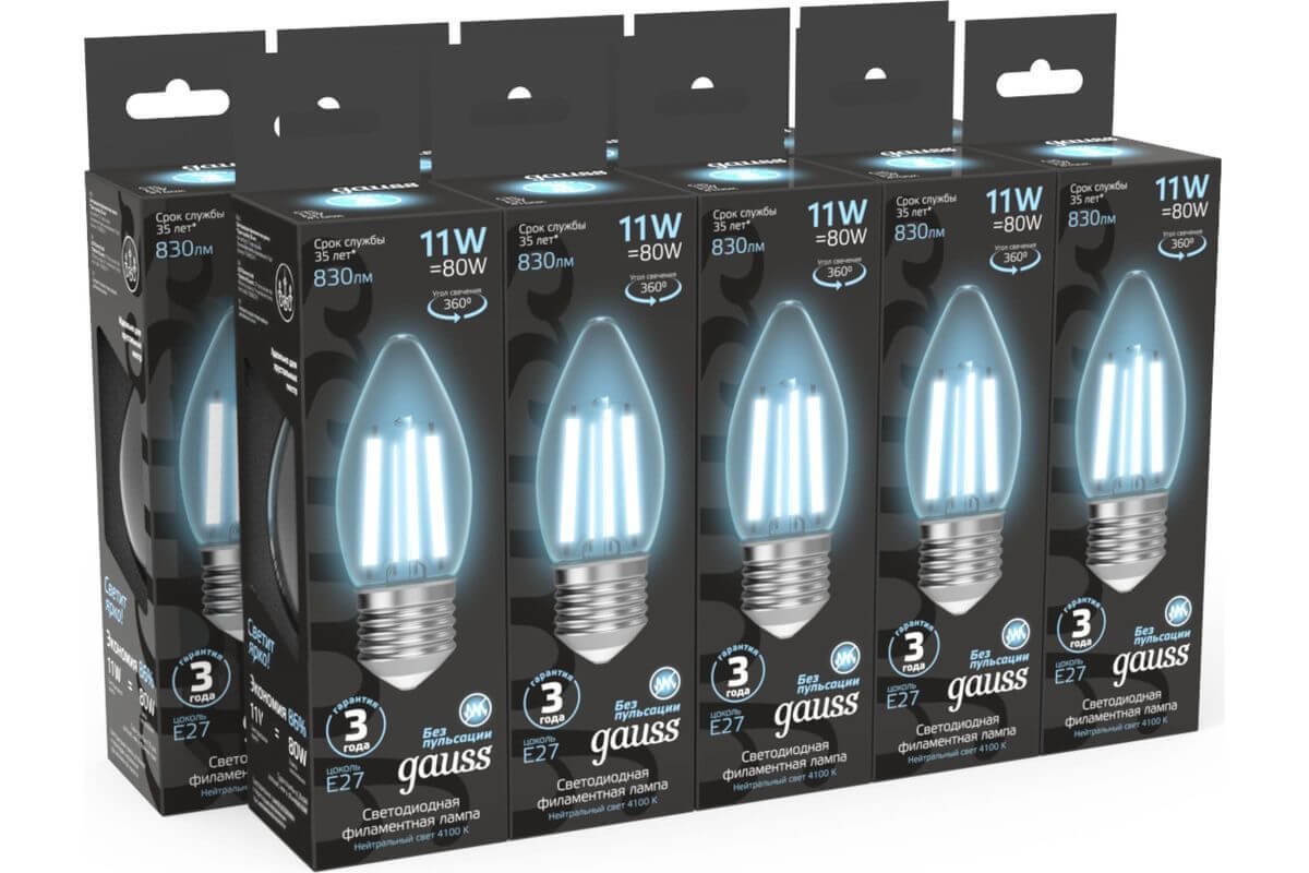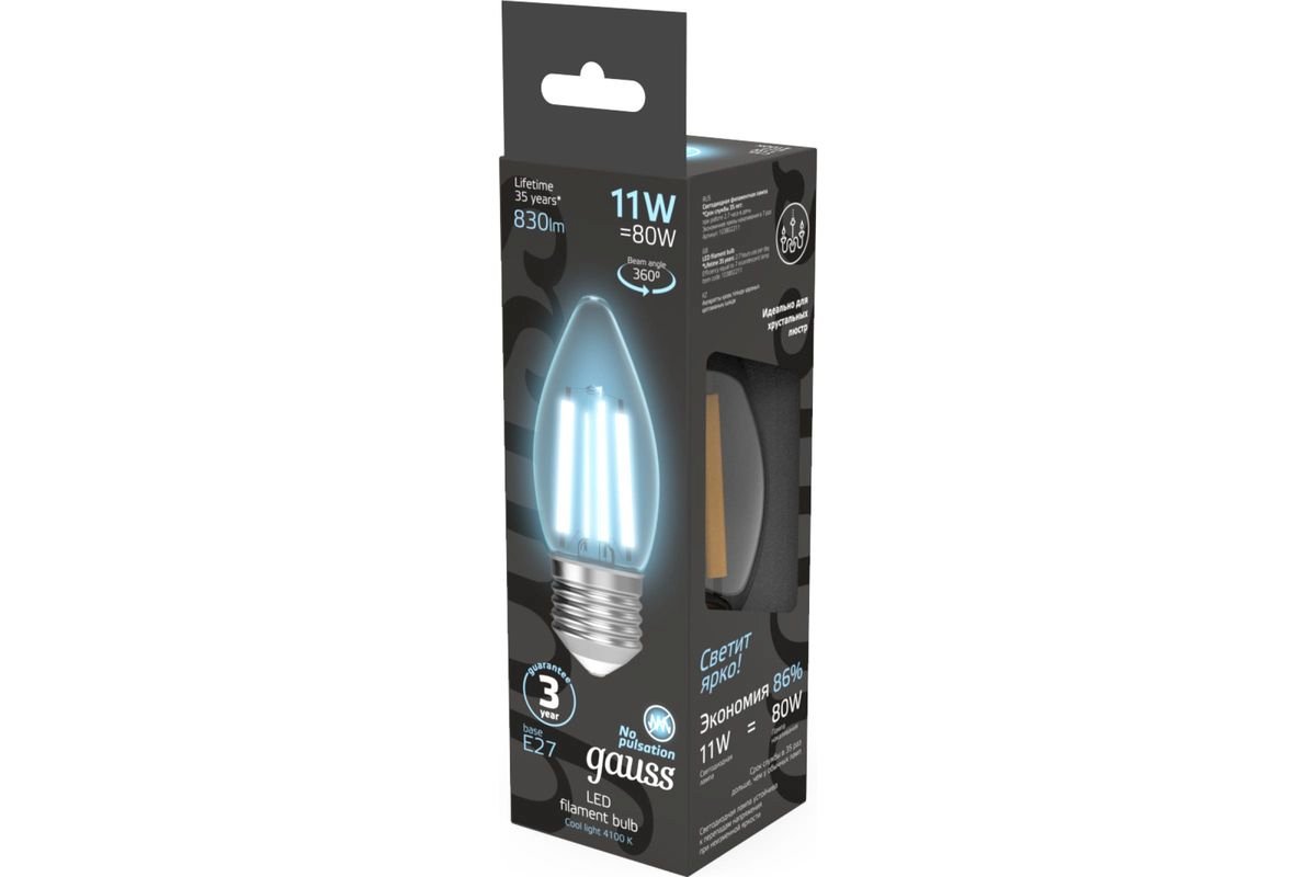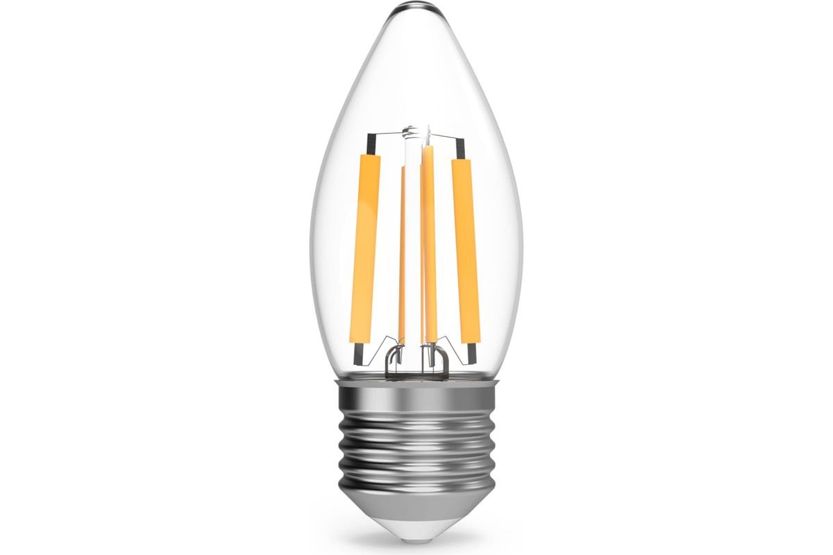 Светодиодная лампочка в форме свечи с цоколем E27 и размерами 92 мм по высоте и диаметром в 35 мм обладает мощностью в 11 W, благодаря чему она может осветить 3.7 кв. м. Цветовая температура – 4100 К, т.е. белый свет, подходящий для рабочего настроя (не рекомендуется для детской комнаты). Изделие рассчитано на использование в сети с переменным напряжением в 220-240В.