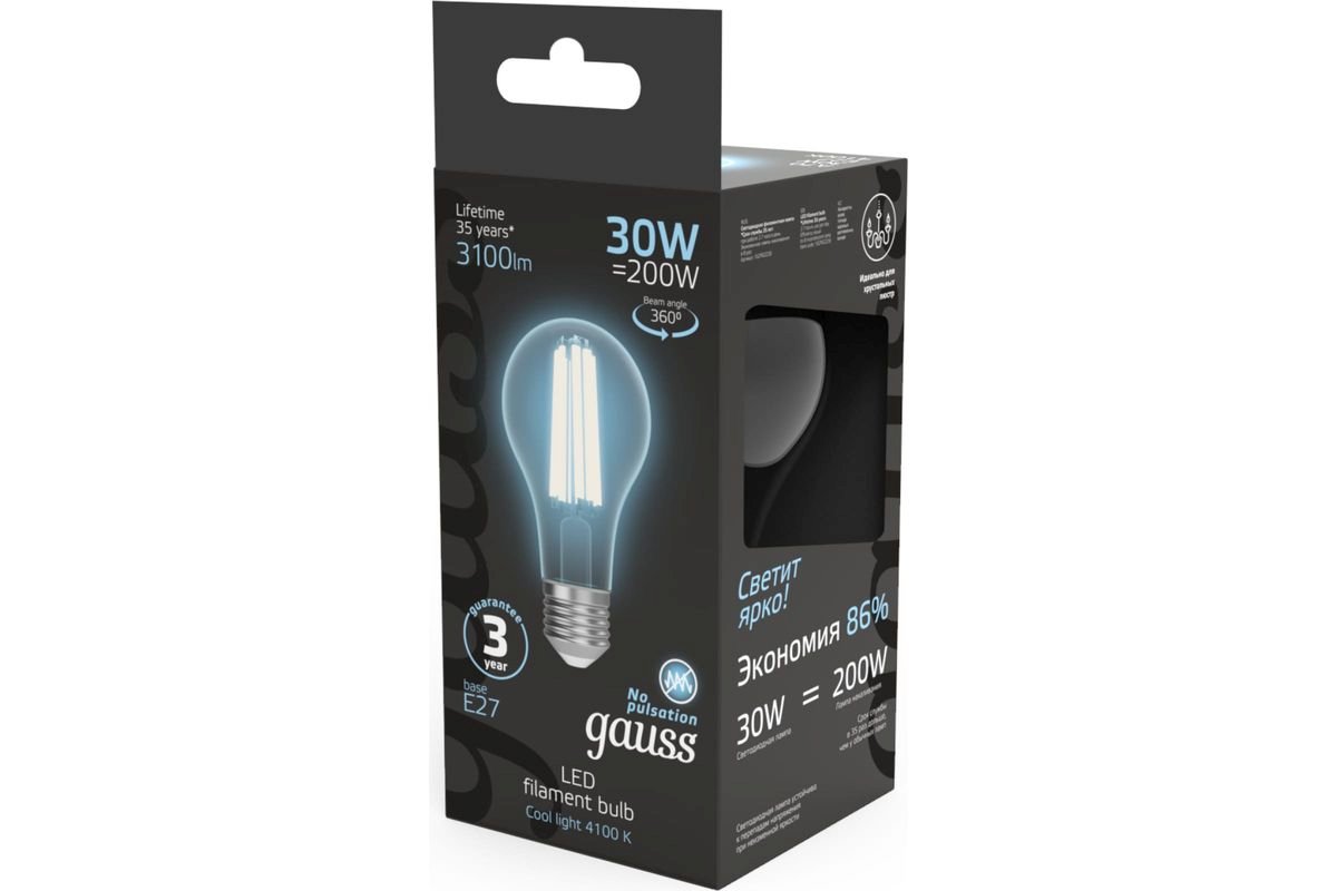 Светодиодная лампочка в форме груши с цоколем E27 и размерами 125 мм по высоте и диаметром в 67 мм обладает мощностью в 30 W, благодаря чему она может осветить 10 кв. м. Цветовая температура – 2700 К, т.е. теплый свет, создающий атмосферу уюта. Изделие рассчитано на использование в сети с переменным напряжением в 220-240В.