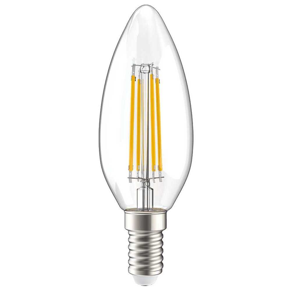 Светодиодная лампочка в форме свечи с цоколем E14 и диаметром в 35 мм обладает мощностью в 7 W, благодаря чему она может осветить 2.3 кв. м. Цветовая температура – 4000 К, т.е. белый свет, подходящий для рабочего настроя (не рекомендуется для детской комнаты). Изделие рассчитано на использование в сети с переменным напряжением в 220-240В.