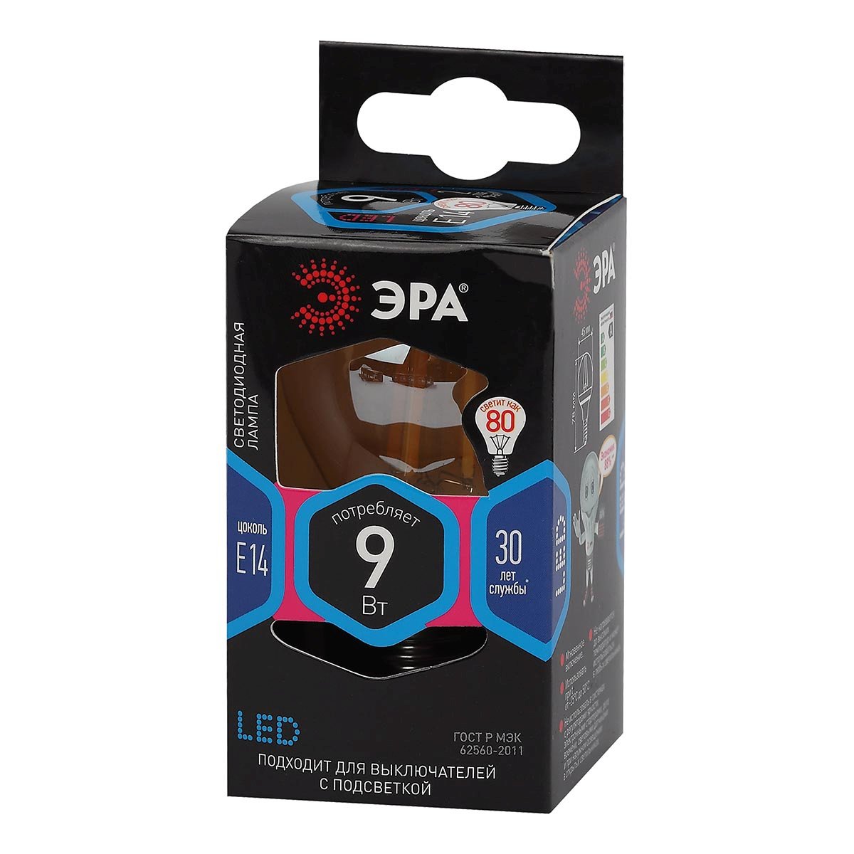 Светодиодная лампочка в форме шара с цоколем E14 и размерами 75 мм по высоте и диаметром в 45 мм обладает мощностью в 9 W, благодаря чему она может осветить 3 кв. м. Цветовая температура – 4000 К, т.е. белый свет, подходящий для рабочего настроя (не рекомендуется для детской комнаты). Изделие рассчитано на использование в сети с переменным напряжением в 220-240В.