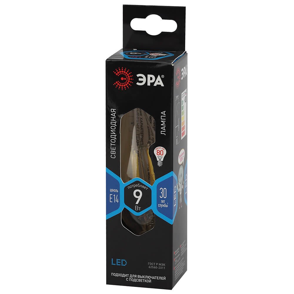 Светодиодная лампочка в форме свечи на ветру с цоколем E14 и размерами 120 мм по высоте и диаметром в 35 мм обладает мощностью в 9 W, благодаря чему она может осветить 3 кв. м. Цветовая температура – 4000 К, т.е. белый свет, подходящий для рабочего настроя (не рекомендуется для детской комнаты). Изделие рассчитано на использование в сети с переменным напряжением в 220-240В.