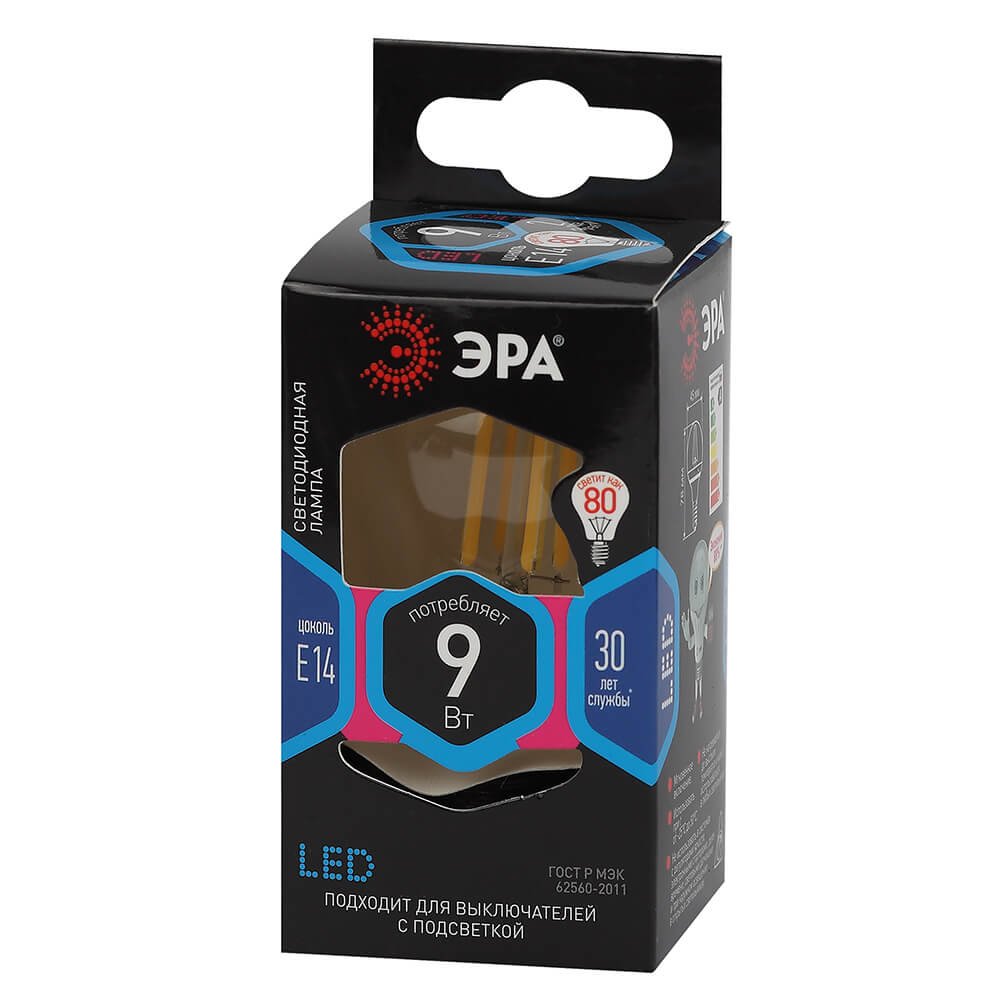 Светодиодная лампочка в форме шара с цоколем E14 и размерами 75 мм по высоте и диаметром в 45 мм обладает мощностью в 9 W, благодаря чему она может осветить 3 кв. м. Цветовая температура – 4000 К, т.е. белый свет, подходящий для рабочего настроя (не рекомендуется для детской комнаты). Изделие рассчитано на использование в сети с переменным напряжением в 220-240В.