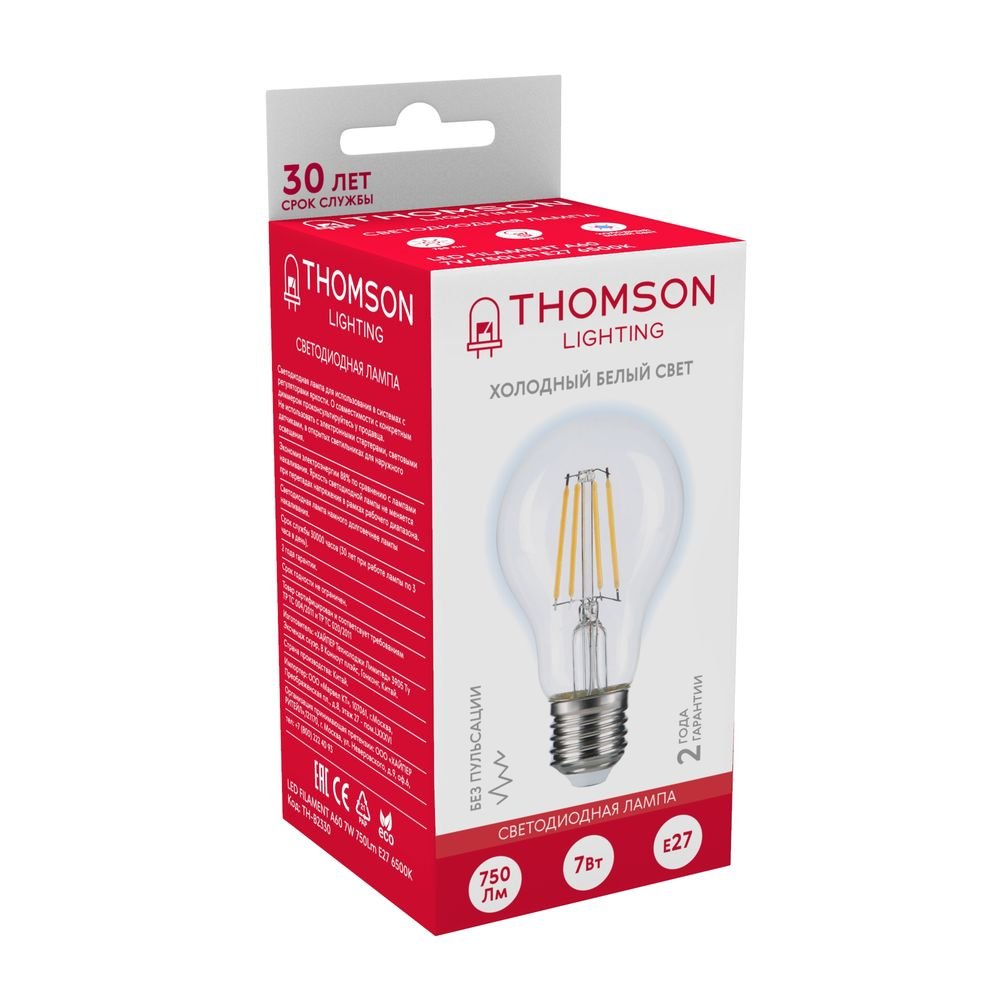 Светодиодная лампочка в форме груши с цоколем E27 и размерами 110 мм по высоте и диаметром в 60 мм обладает мощностью в 7 W, благодаря чему она может осветить 3 кв. м. Цветовая температура – 6500 К, т.е. холодный свет синего оттенка (не рекомендуется для применения на кухне, так как искажает цвет готовых блюд). Изделие рассчитано на использование в сети с переменным напряжением в 170-265В.