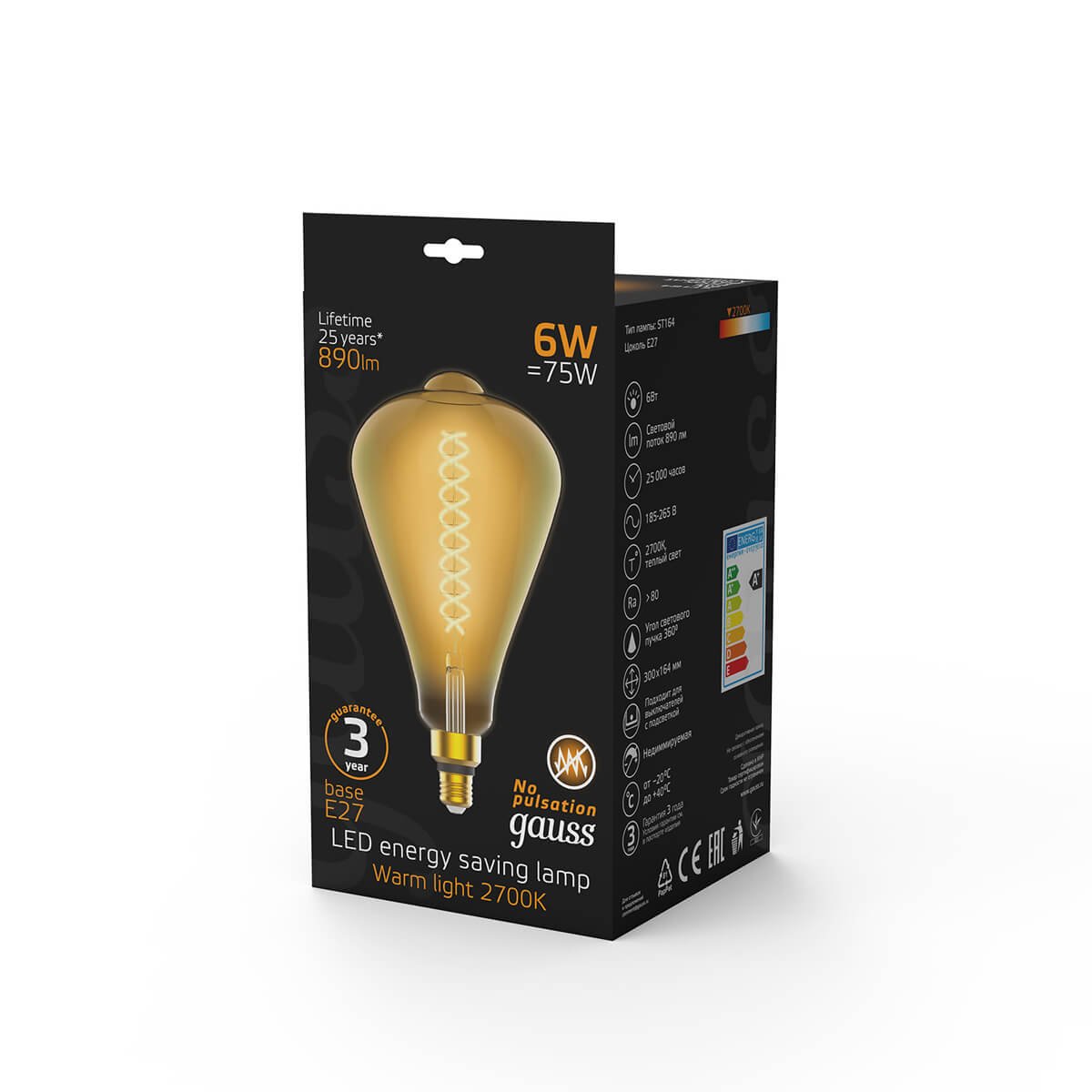 Светодиодная лампочка в форме колбы с цоколем E27 и размерами 297 мм по высоте и диаметром в 164 мм обладает мощностью в 6 W, благодаря чему она может осветить 2 кв. м. Цветовая температура – 2700 К, т.е. теплый свет, создающий атмосферу уюта. Изделие рассчитано на использование в сети с переменным напряжением в 220-240В.