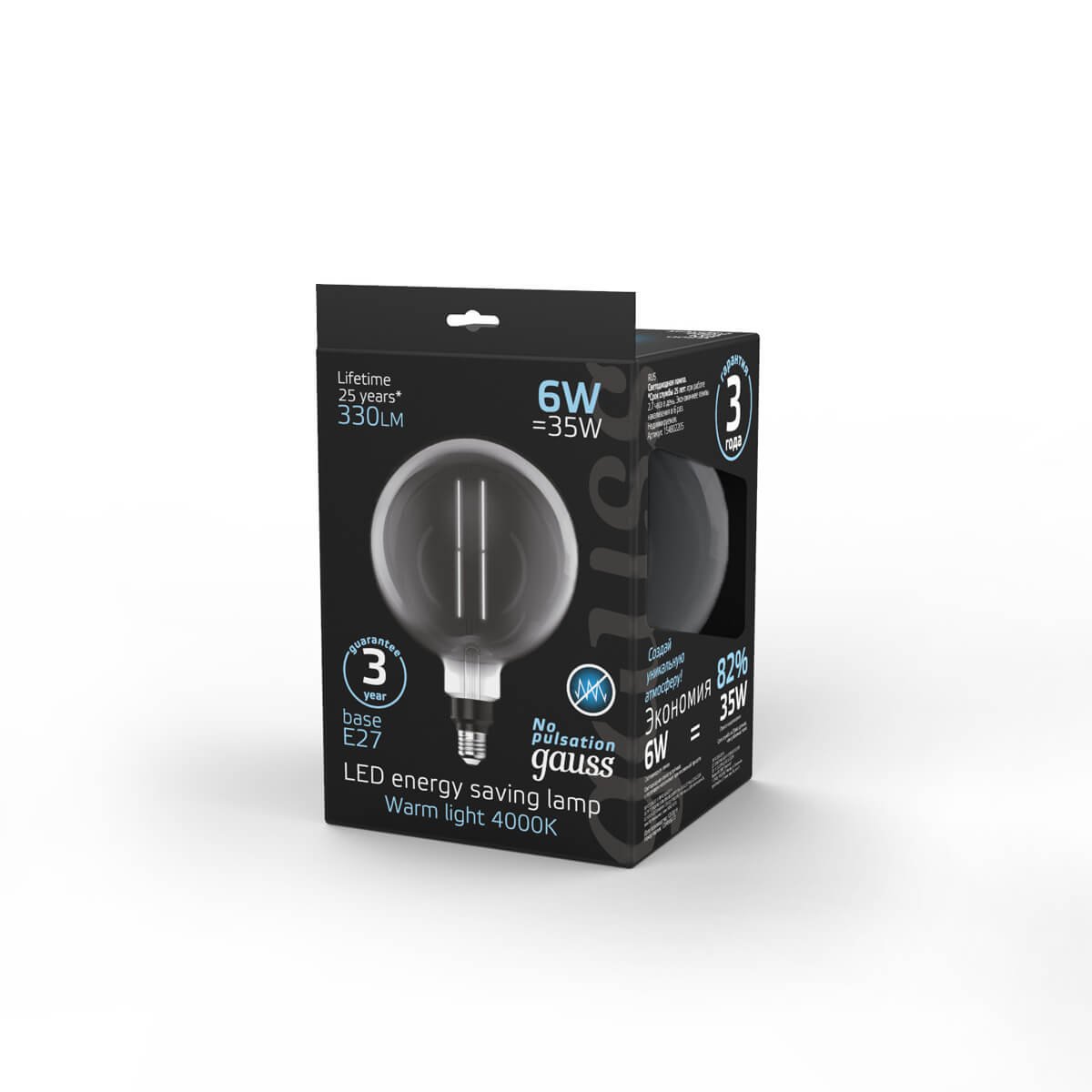 Светодиодная лампочка в форме шара с цоколем E27 и размерами 283 мм по высоте и диаметром в 200 мм обладает мощностью в 6 W, благодаря чему она может осветить 2 кв. м. Цветовая температура – 4000 К, т.е. белый свет, подходящий для рабочего настроя (не рекомендуется для детской комнаты). Изделие рассчитано на использование в сети с переменным напряжением в 220-240В.