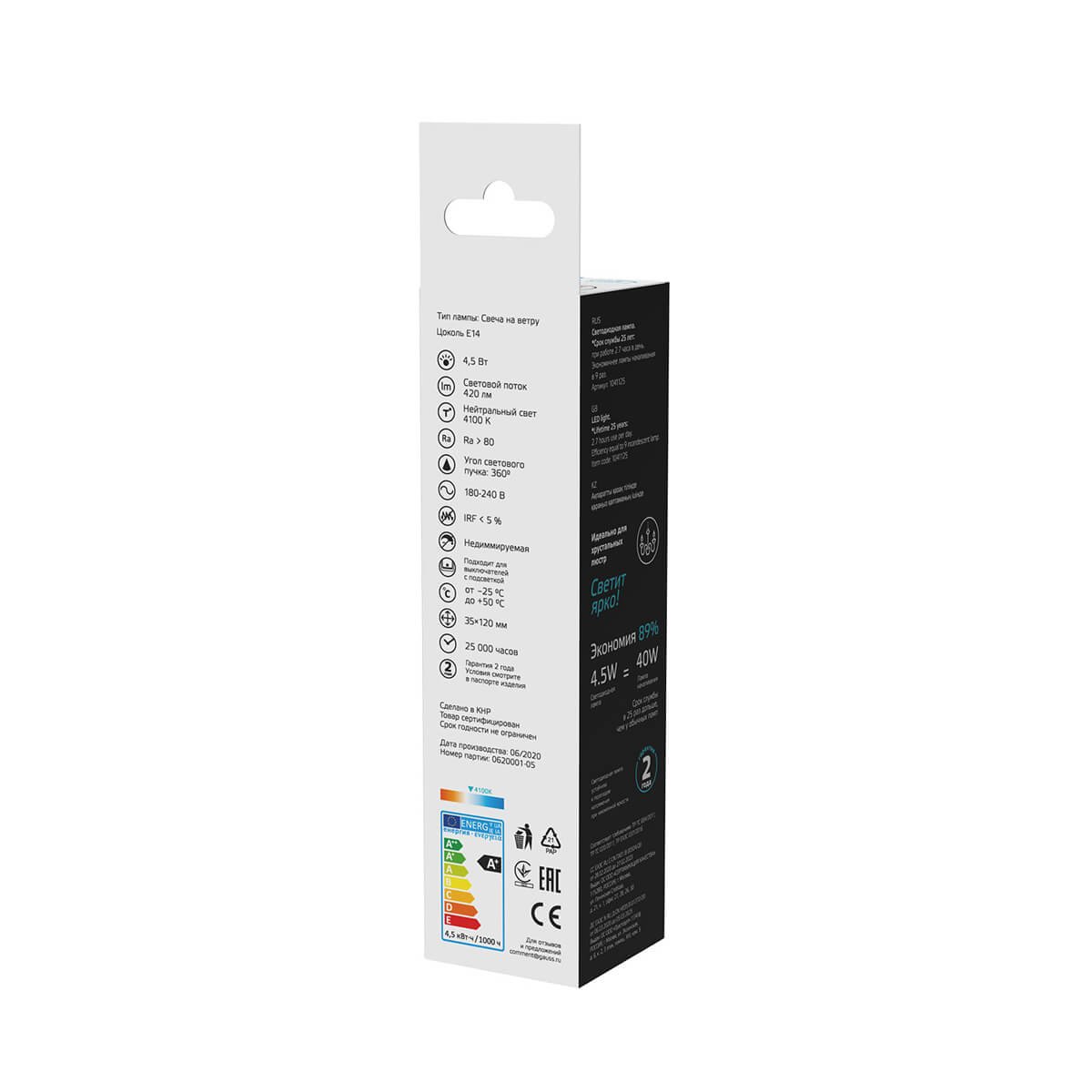 Светодиодная лампочка в форме свечи на ветру с цоколем E14 и размерами 120 мм по высоте и диаметром в 35 мм обладает мощностью в 4.5 W, благодаря чему она может осветить 1.5 кв. м. Цветовая температура – 4100 К, т.е. белый свет, подходящий для рабочего настроя (не рекомендуется для детской комнаты). Изделие рассчитано на использование в сети с переменным напряжением в 220-240В.