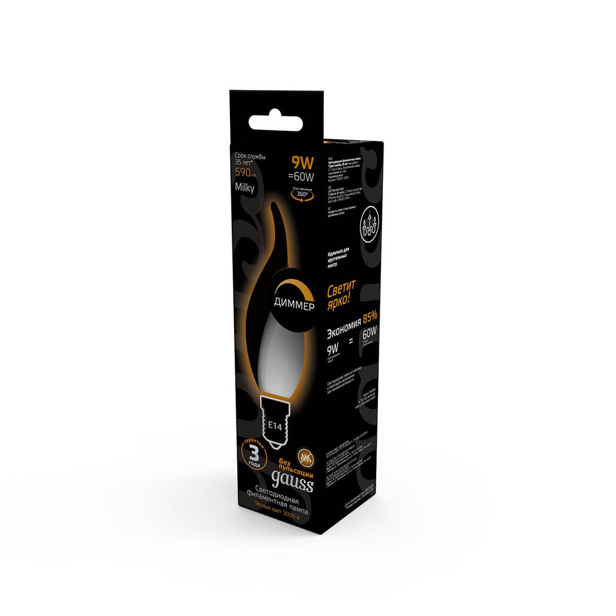 Светодиодная лампочка в форме свечи на ветру с цоколем E14 и размерами 120 мм по высоте и диаметром в 35 мм обладает мощностью в 9 W, благодаря чему она может осветить 3 кв. м. Цветовая температура – 3000 К, т.е. теплый свет, создающий атмосферу уюта. Изделие рассчитано на использование в сети с переменным напряжением в 220-240В.